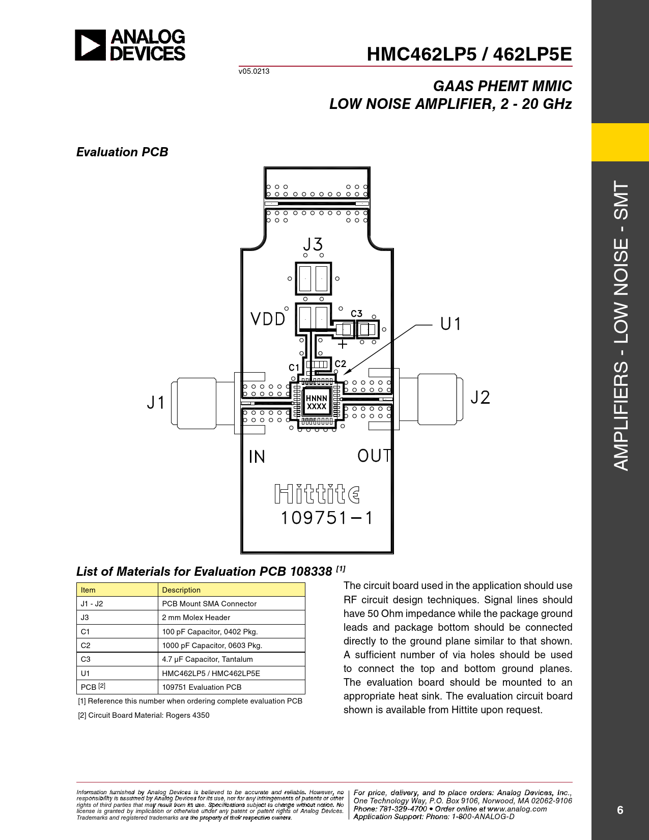 HMC462LP5 / 462LP5E. GAAS PHEMT MMIC. LOW NOISE AMPLIFIER, 2 - 20 GHz. Evaluation PCB