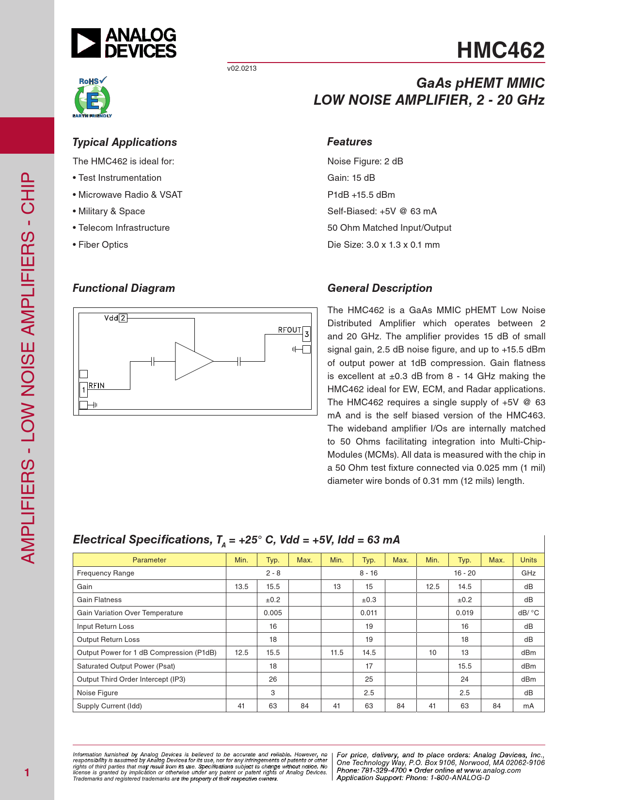 HMC462 v02.0213 GaAs pHEMT MMICLOW NOISE AMPLIFIER, 2 - 20 GHzTypical ApplicationsFeatures The hmC462 is ideal for: Noise figure: 2 dB ip • Test instrumentation Gain: 15 dB h • microwave radio & VsAT p1dB +15.5 dBm C • military & space self-Biased: +5V @ 63 mA - s • Telecom infrastructure 50 ohm matched input/output r • fiber optics Die size: 3.0 x 1.3 x 0.1 mm ie lif Functional DiagramGeneral Description p m The hmC462 is a GaAs mmiC phemT low Noise Distributed Amplifier which operates between 2 A and 20 Ghz. The amplifier provides 15 dB of small e signal gain, 2.5 dB noise figure, and up to +15.5 dBm is of output power at 1dB compression. Gain flatness o is excel ent at ±0.3 dB from 8 - 14 Ghz making the N hmC462 ideal for ew, eCm, and radar applications. The hmC462 requires a single supply of +5V @ 63 w mA and is the self biased version of the hmC463. The wideband amplifier i/os are internal y matched lo to 50 ohms facilitating integration into multi-Chip- - s modules (mCms). All data is measured with the chip in r a 50 ohm test fixture connected via 0.025 mm (1 mil) diameter wire bonds of 0.31 mm (12 mils) length. ie lif p m Electrical Specifications, T = +25° C, Vdd = +5V, Idd = 63 mAA A parameter min. Typ. max. min. Typ. max. min. Typ. max. Units frequency range 2 - 8 8 - 16 16 - 20 Ghz Gain 13.5 15.5 13 15 12.5 14.5 dB Gain flatness ±0.2 ±0.3 ±0.2 dB Gain Variation over Temperature 0.005 0.011 0.019 dB/ °C input return loss 16 19 16 dB output return loss 18 19 18 dB output power for 1 dB Compression (p1dB) 12.5 15.5 11.5 14.5 10 13 dBm saturated output power (psat) 18 17 15.5 dBm output Third order intercept (ip3) 26 25 24 dBm Noise figure 3 2.5 2.5 dB supply Current (idd) 41 63 84 41 63 84 41 63 84 mA Inf F or o m r p atio r n ifc ur e n , d ishe e d lbiv y e A r n y a alog n D d t evic o p es is la beclie o eved rd to ebre sa: H ccur iattti e tae M nd re ilicarbloew . H a o ve C wever, o n rp o For price, delivery, and to place orders: Analog Devices, Inc., responsibility is assumed by Analog Devices for its use, nor for any infringements of patents or other oration, 2 Elizabeth Drive, Chelmsford, MA 01824 One Technology Way, P.O. Box 9106, Norwood, MA 02062-9106 Phone: 978-250-3343 Fax: 978-250-3373 O rights of third parties that may result from its use. Specifications subject to change without notice. No P rd hone e r O : 7 n 81- -3li 2n 9 e a -47 t w 0 w 0 • O w rd .h e it r o t niltie n .c e ao t m 1 license is granted by implication or otherwise under any patent or patent rights of Analog Devices. www.analog.com Application Support: Pho Trademarks and registered trademarks are the property of their respective owners. ne: 978-250-33 A 4 p 3 p o lica rti a o p n S p u s p @ po h rt itt : P ite ho . n c e om : 1-800-ANALOG-D