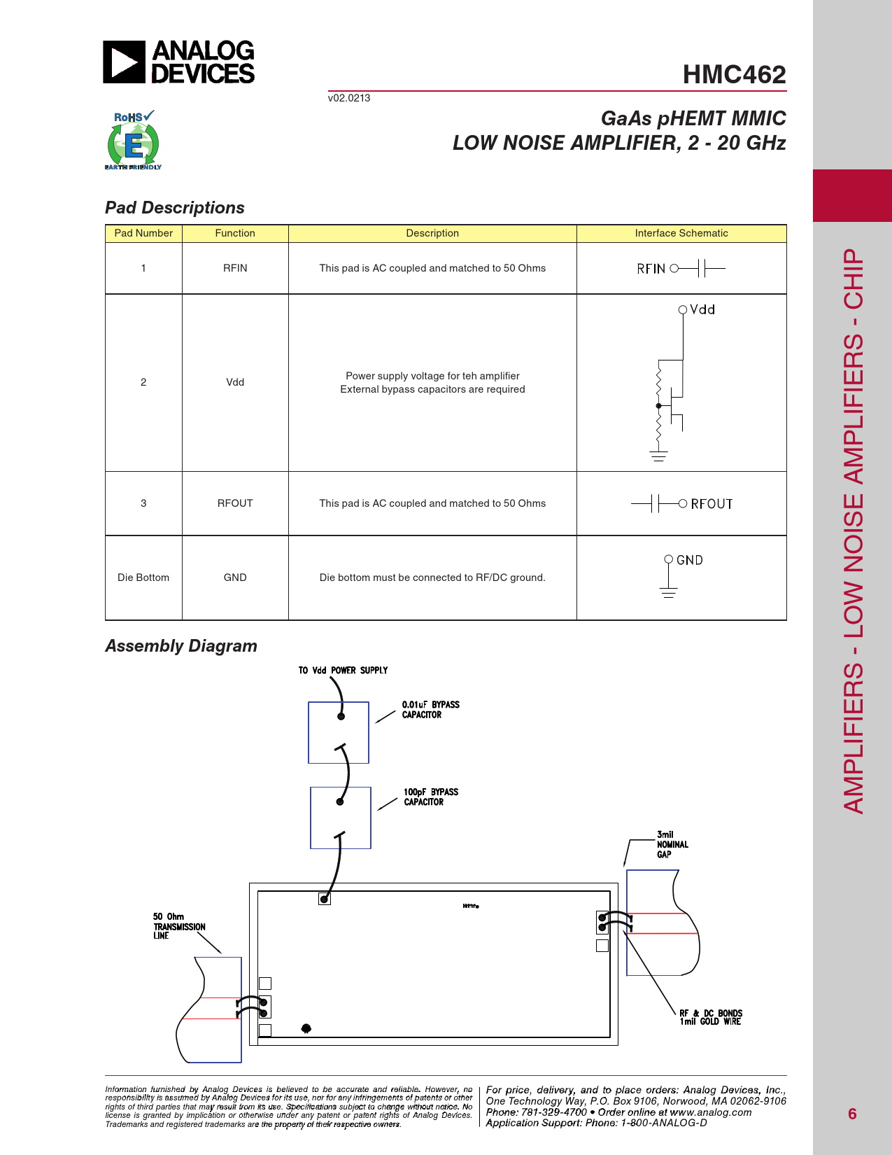 HMC462. GaAs pHEMT MMIC. LOW NOISE AMPLIFIER, 2 - 20 GHz. Pad Descriptions. Assembly Diagram