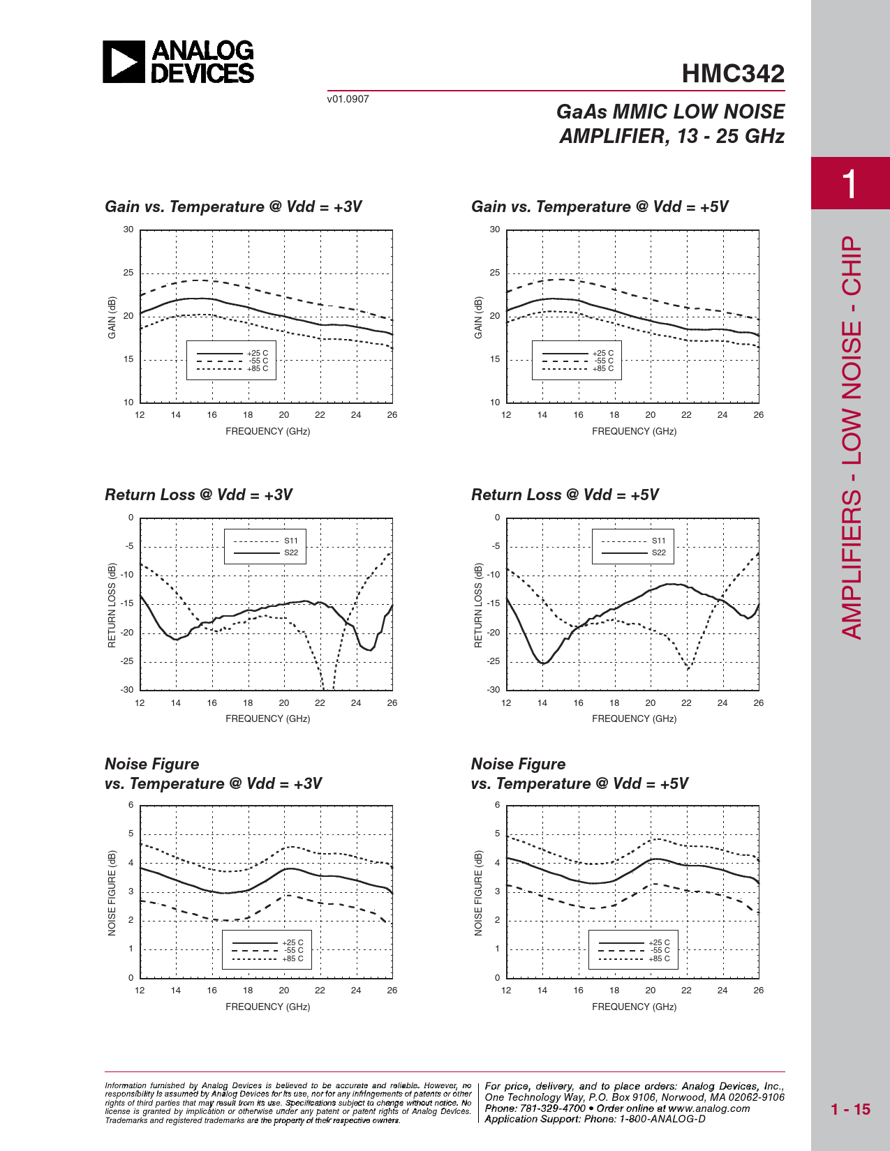 HMC342 v01.0907 GaAs MMIC LOW NOISEAMPLIFIER, 13 - 25 GHz 1 Gain vs. Temperature @ Vdd = +3VGain vs. Temperature @ Vdd = +5V 30 30 IP 25 25 H 20 20 GAIN (dB) GAIN (dB) E - C +25 C +25 C 15 -55 C 15 -55 C IS +85 C +85 C 10 10 12 14 16 18 20 22 24 26 12 14 16 18 20 22 24 26 FREQUENCY (GHz) FREQUENCY (GHz) W NO O Return Loss @ Vdd = +3VReturn Loss @ Vdd = +5V S - L 0 0 R S11 S11 -5 -5 IE S22 S22 IF -10 -10 L P -15 -15 M -20 -20 A RETURN LOSS (dB) RETURN LOSS (dB) -25 -25 -30 -30 12 14 16 18 20 22 24 26 12 14 16 18 20 22 24 26 FREQUENCY (GHz) FREQUENCY (GHz) Noise FigureNoise Figurevs. Temperature @ Vdd = +3Vvs. Temperature @ Vdd = +5V 6 6 5 5 4 4 3 3 2 2 NOISE FIGURE (dB) NOISE FIGURE (dB) +25 C +25 C 1 -55 C 1 -55 C +85 C +85 C 0 0 12 14 16 18 20 22 24 26 12 14 16 18 20 22 24 26 FREQUENCY (GHz) FREQUENCY (GHz) Info F rmoatr pr ion f iurcne, de ished b ly iv A e n r al y o a g D n evd to p ices is bla eli c eve o ed t rde o be ras: H ccuratite tiatne M d reli iacr ble ow . Ho av wev e C er, n o o rpo Fora r t p iro ic n e ,, 2 d 0 eli A ve lrpha R y, and toad, C o place hoel rd m er s s fo : Ard, MA 01 nalog Devic 8 e 2 s 4 , Inc., responsibility is assumed by Analog Devices for its use, nor for any infringements of patents or other One Technology Way, P.O. Box 9106, Norwood, MA 02062-9106 Phone: 978-250-3343 Fax: 978-250-3373 O rights of third parties that may result from its use. Specifications subject to change without notice. No P rde hone r O : 7 n 81- -3li 2n 9 e a -47 t w 0 w 0 • O w rd .ehit r o t nilte in .c e ao t m license is granted by implication or otherwise under any patent or patent rights of Analog Devices. www.analog.com 1 - 15 Application Support: Pho Trademarks and registered trademarks are the property of their respective owners. ne: 978-250-33 A 4 p 3 o plica r app tion Su s p @ po h rt itt : P ite ho .c ne o : 1m -800-ANALOG-D
