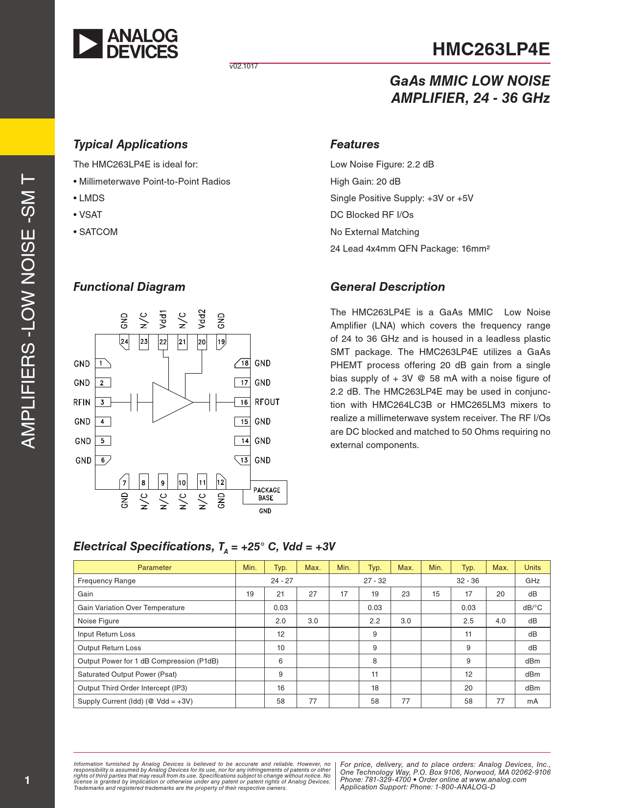 HMC263LP4E v02.1017 GaAs MMIC LOW NOISEAMPLIFIER, 24 - 36 GHzTypical ApplicationsFeatures The HmC263lp4e is ideal for: low Noise figure: 2.2 dB T • mil imeterwave point-to-point radios High Gain: 20 dB m • lmDs single positive supply: +3V or +5V s • VsAT DC Blocked rf i/os e - • sATCom No external matching is 24 lead 4x4mm QfN package: 16mm² o Functional DiagramGeneral Description w N The HmC263lp4e is a GaAs mmiC low Noise lo Amplifier (lNA) which covers the frequency range s - of 24 to 36 GHz and is housed in a leadless plastic r smT package. The HmC263lp4e utilizes a GaAs pHemT process offering 20 dB gain from a single ie bias supply of + 3V @ 58 mA with a noise figure of 2.2 dB. The HmC263lp4e may be used in conjunc- lif p tion with HmC264lC3B or HmC265lm3 mixers to realize a mil imeterwave system receiver. The rf i/os m are DC blocked and matched to 50 ohms requiring no A external components. Electrical Specifications, T = +25° C, Vdd = +3VA parameter min. Typ. max. min. Typ. max. min. Typ. max. Units frequency range 24 - 27 27 - 32 32 - 36 GHz Gain 19 21 27 17 19 23 15 17 20 dB Gain Variation over Temperature 0.03 0.03 0.03 dB/°C Noise figure 2.0 3.0 2.2 3.0 2.5 4.0 dB input return loss 12 9 11 dB output return loss 10 9 9 dB output power for 1 dB Compression (p1dB) 6 8 9 dBm saturated output power (psat) 9 11 12 dBm output Third order intercept (ip3) 16 18 20 dBm supply Current (idd) (@ Vdd = +3V) 58 77 58 77 58 77 mA Information furnished by Analog Devices is believed to be accurate and reliable. However, no For price, delivery, and to place orders: Analog Devices, Inc., responsibility is assumed by Analog Devices for its use, nor for any infringements of patents or other One Technology Way, P.O. Box 9106, Norwood, MA 02062-9106 1 rights of third parties that may result from its use. Specifications subject to change without notice. No Phone: 781-329-4700 • Order online at www.analog.com license is granted by implication or otherwise under any patent or patent rights of Analog Devices. Trademarks and registered trademarks are the property of their respective owners. Application Support: Phone: 1-800-ANALOG-D Document Outline Typical Applications Features Functional Diagram General Description Electrical Specifications Output IP3 @ Vdd = +5V Output IP3 @ Vdd = +3V Psat @ Vdd = +5V Psat @ Vdd = +3V Output P1dB @ Vdd = +5V Isolation @ Vdd = +5V Isolation @ Vdd = +3V Noise Figure vs. Temperature @ Vdd = +5V Noise Figure vs. Temperature @ Vdd = +3V Output Return Loss @ Vdd = +5V Output Return Loss @ Vdd = +3V Input Return Loss @ Vdd = +5V Input Return Loss @ Vdd = +3V Gain vs. Temperature @ Vdd = +5V Gain vs. Temperature @ Vdd = +3V Output P1dB @ Vdd = +3V Absolute Maximum Ratings Outline Drawing Package Information Pin Description Application Circuit Evaluation PCB List of Materials