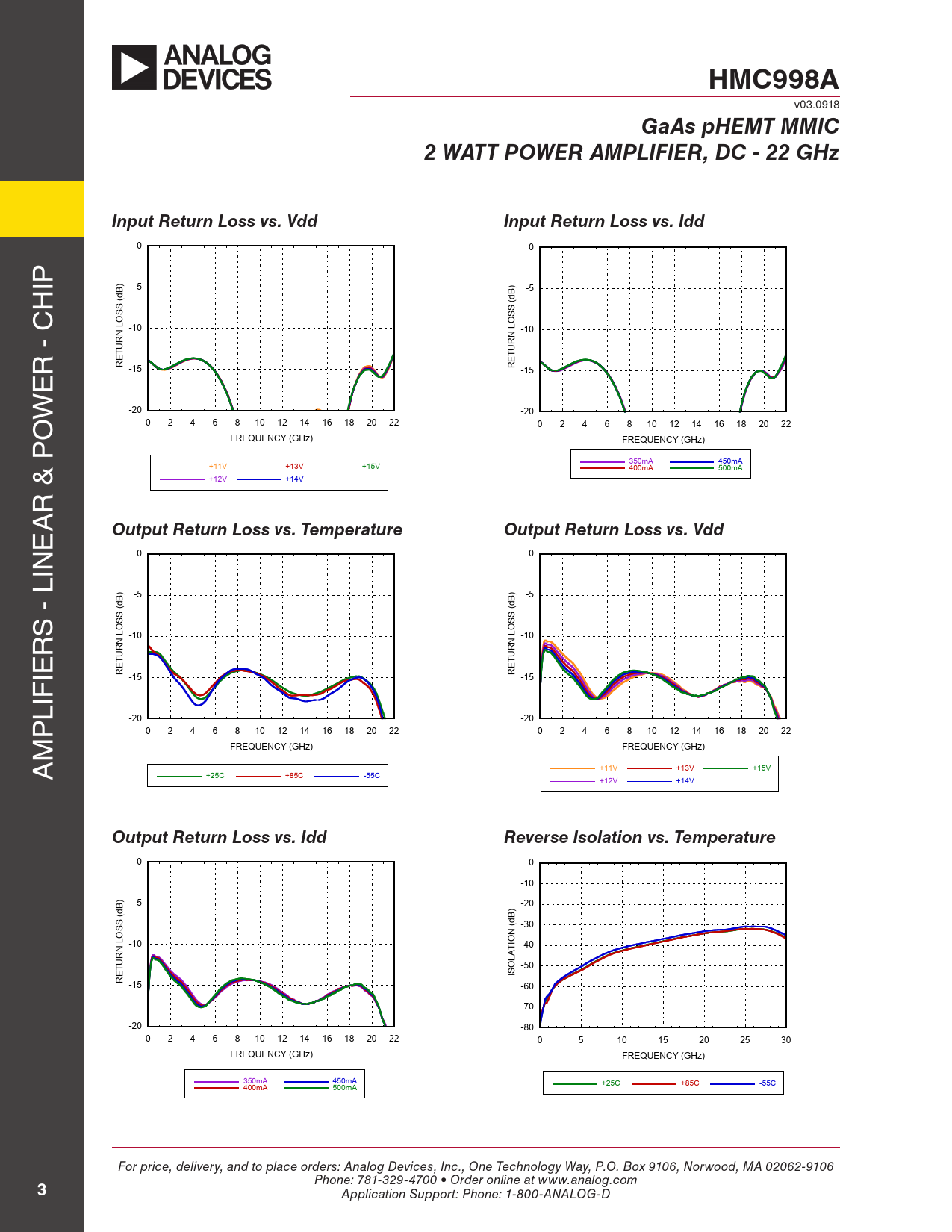0 0 -10 -5 -20 -30 -10 ION (dB) -40 URN LOSS (dB) -50 ISOLAT RET -15 -60 -70 -20 -80 0 2 4 6 8 10 12 14 16 18 20 22 0 5 10 15 20 25 30 FREQUENCY (GHz) FREQUENCY (GHz) 350mA 450mA 400mA 500mA +25C +85C -55C For price, delivery, and to place orders: Analog Devices, Inc., One Technology Way, P.O. Box 9106, Norwood, MA 02062-9106 Phone: 781-329-4700 • Order online at www.analog.com
