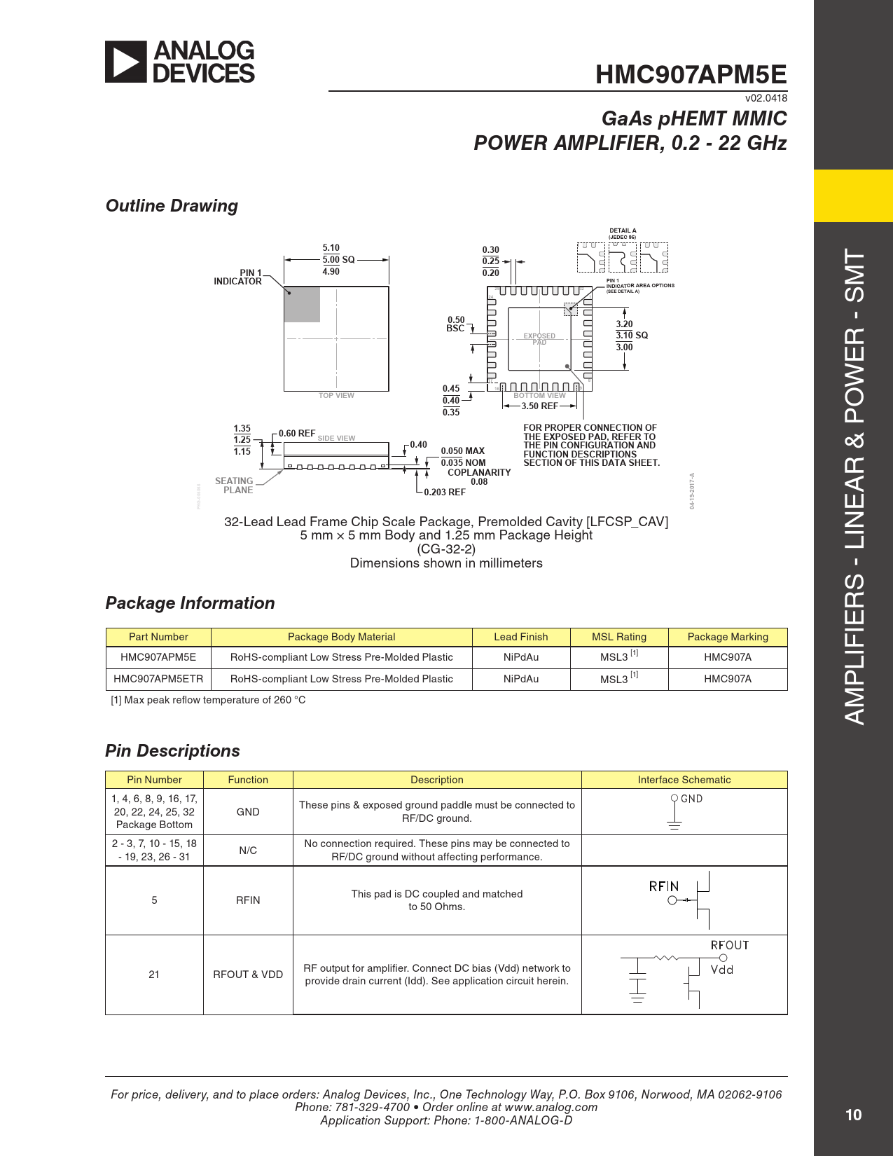 HMC907APM5E. GaAs pHEMT MMIC. POWER AMPLIFIER, 0.2 - 22 GHz