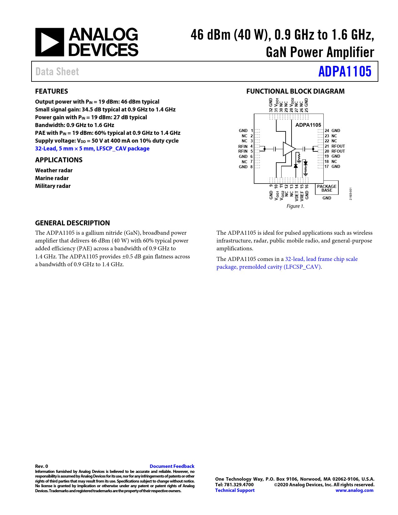 46 dBm (40 W), 0.9 GHz to 1.6 GHz,. GaN Power Amplifier. Data Sheet. ADPA1105. FEATURES. FUNCTIONAL BLOCK DIAGRAM