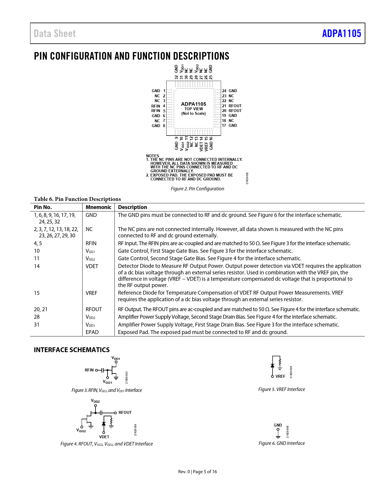 link to page 5 link to page 5 link to page 5 link to page 5 link to page 5 link to page 5 link to page 5 Data SheetADPA1105PIN CONFIGURATION AND FUNCTION DESCRIPTIONSDDDD1DD2GNVNCNCVNCNCGN3231302928272625GND 124 GNDNC 223 NCNC 322 NCADPA1105RFIN 421 RFOUTRFIN 5TOP VIEW20 RFOUT(Not to Scale)GND 619 GNDNC 718 NCGND 817 GND910111213141516DDNCNCETEFGNGG1GG2VVVDVRGNNOTES1. THE NC PINS ARE NOT CONNECTED INTERNALLY.HOWEVER, ALL DATA SHOWN IS MEASUREDWITH THE NC PINS CONNECTED TO RF AND DCGROUND EXTERNALLY. 2. EXPOSED PAD. THE EXPOSED PAD MUST BE 002 CONNECTED TO RF AND DC GROUND. 25- 19 2 Figure 2. Pin Configuration Table 6. Pin Function Descriptions Pin No.MnemonicDescription 1, 6, 8, 9, 16, 17, 19, GND The GND pins must be connected to RF and dc ground. See Figure 6 for the interface schematic. 24, 25, 32 2, 3, 7, 12, 13, 18, 22, NC The NC pins are not connected internally. However, all data shown is measured with the NC pins 23, 26, 27, 29, 30 connected to RF and dc ground externally. 4, 5 RFIN RF Input. The RFIN pins are ac-coupled and are matched to 50 Ω. See Figure 3 for the interface schematic. 10 VGG1 Gate Control, First Stage Gate Bias. See Figure 3 for the interface schematic. 11 VGG2 Gate Control, Second Stage Gate Bias. See Figure 4 for the interface schematic. 14 VDET Detector Diode to Measure RF Output Power. Output power detection via VDET requires the application of a dc bias voltage through an external series resistor. Used in combination with the VREF pin, the difference in voltage (VREF − VDET) is a temperature compensated dc voltage that is proportional to the RF output power. 15 VREF Reference Diode for Temperature Compensation of VDET RF Output Power Measurements. VREF requires the application of a dc bias voltage through an external series resistor. 20, 21 RFOUT RF Output. The RFOUT pins are ac-coupled and are matched to 50 Ω. See Figure 4 for the interface schematic. 28 VDD2 Amplifier Power Supply Voltage, Second Stage Drain Bias. See Figure 4 for the interface schematic. 31 VDD1 Amplifier Power Supply Voltage, First Stage Drain Bias. See Figure 3 for the interface schematic. EPAD Exposed Pad. The exposed pad must be connected to RF and dc ground. INTERFACE SCHEMATICSVDD1RFIN 005 5- 003 5- VREF 2192 VGG1 2192 Figure 3. RFIN, V Figure 5. VREF Interface GG1, and VDD1 Interface VDD2RFOUTGND 004 06 V 5- 0 GG2 5- 92 VDET 2192 21 Figure 4. RFOUT, V Figure 6. GND Interface GG2, VDD2, and VDET Interface Rev. 0 | Page 5 of 16 Document Outline FEATURES APPLICATIONS FUNCTIONAL BLOCK DIAGRAM GENERAL DESCRIPTION TABLE OF CONTENTS REVISION HISTORY SPECIFICATIONS ELECTRICAL SPECIFICATIONS ABSOLUTE MAXIMUM RATINGS THERMAL RESISTANCE ELECTROSTATIC DISCHARGE (ESD) RATINGS ESD Ratings for ADPA1105 ESD CAUTION PIN CONFIGURATION AND FUNCTION DESCRIPTIONS INTERFACE SCHEMATICS TYPICAL PERFORMANCE CHARACTERISTICS THEORY OF OPERATION APPLICATIONS INFORMATION BASIC CONNECTIONS THERMAL MANAGEMENT OUTLINE DIMENSIONS ORDERING GUIDE