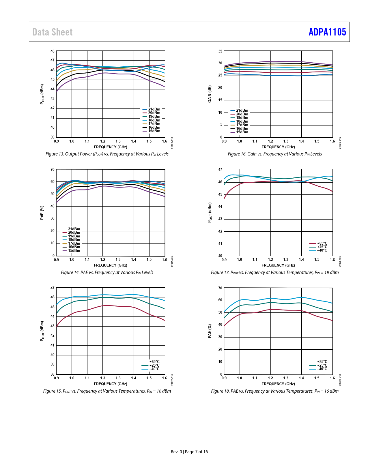 Data SheetADPA110548354730462545) m)44B20d(dB(TIN43AOU15PG4221dBm21dBm20dBm1020dBm4119dBm19dBm18dBm18dBm17dBm517dBm4016dBm16dBm15dBm15dBm39 3 0 6 0.91.01.11.21.31.41.51.6 01 01 5- 0.91.01.11.21.31.41.51.6 5- FREQUENCY (GHz) 2192 FREQUENCY (GHz) 2192 Figure 13. Output Power (POUT) vs. Frequency at Various PIN Levels Figure 16. Gain vs. Frequency at Various PIN Levels 704760465045))40m44(%dBE( TPA30OU43P2021dBm20dBm4219dBm18dBm1017dBm41+85°C16dBm+25°C15dBm–40°C0 4 40 7 0.91.01.11.21.31.41.51.6 01 01 5- 0.91.01.11.21.31.41.51.6 5- FREQUENCY (GHz) 2192 FREQUENCY (GHz) 2192 Figure 14. PAE vs. Frequency at Various PIN Levels Figure 17. POUT vs. Frequency at Various Temperatures, PIN = 19 dBm 47704660455044) m43)40dB(%( TE42OUPA30P412040+85°C10+85°C39+25°C+25°C–40°C–40°C38 5 0 8 0.91.01.11.21.31.41.51.6 01 01 5- 0.91.01.11.21.31.41.51.6 5- FREQUENCY (GHz) 2192 FREQUENCY (GHz) 2192 Figure 15. POUT vs. Frequency at Various Temperatures, PIN = 16 dBm Figure 18. PAE vs. Frequency at Various Temperatures, PIN = 16 dBm Rev. 0 | Page 7 of 16 Document Outline FEATURES APPLICATIONS FUNCTIONAL BLOCK DIAGRAM GENERAL DESCRIPTION TABLE OF CONTENTS REVISION HISTORY SPECIFICATIONS ELECTRICAL SPECIFICATIONS ABSOLUTE MAXIMUM RATINGS THERMAL RESISTANCE ELECTROSTATIC DISCHARGE (ESD) RATINGS ESD Ratings for ADPA1105 ESD CAUTION PIN CONFIGURATION AND FUNCTION DESCRIPTIONS INTERFACE SCHEMATICS TYPICAL PERFORMANCE CHARACTERISTICS THEORY OF OPERATION APPLICATIONS INFORMATION BASIC CONNECTIONS THERMAL MANAGEMENT OUTLINE DIMENSIONS ORDERING GUIDE