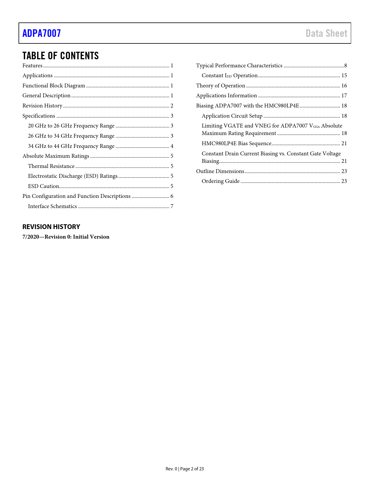 link to page 1 link to page 1 link to page 1 link to page 1 link to page 2 link to page 3 link to page 3 link to page 3 link to page 4 link to page 5 link to page 5 link to page 5 link to page 5 link to page 6 link to page 7 link to page 8 link to page 15 link to page 16 link to page 17 link to page 18 link to page 18 link to page 18 link to page 18 link to page 21 link to page 21 link to page 21 link to page 23 link to page 23 ADPA7007Data SheetTABLE OF CONTENTS Features .. 1 Typical Performance Characteristics ...8 Applications .. 1 Constant IDD Operation ... 15 Functional Block Diagram .. 1 Theory of Operation .. 16 General Description ... 1 Applications Information ... 17 Revision History ... 2 Biasing ADPA7007 with the HMC980LP4E .. 18 Specifications .. 3 Application Circuit Setup ... 18 20 GHz to 26 GHz Frequency Range .. 3 Limiting VGATE and VNEG for ADPA7007 VGGx Absolute 26 GHz to 34 GHz Frequency Range .. 3 Maximum Rating Requirement ... 18 34 GHz to 44 GHz Frequency Range .. 4 HMC980LP4E Bias Sequence ... 21 Absolute Maximum Ratings ... 5 Constant Drain Current Biasing vs. Constant Gate Voltage Biasing .. 21 Thermal Resistance .. 5 Outline Dimensions ... 23 Electrostatic Discharge (ESD) Ratings .. 5 Ordering Guide .. 23 ESD Caution.. 5 Pin Configuration and Function Descriptions .. 6 Interface Schematics .. 7 REVISION HISTORY 7/2020—Revision 0: Initial Version Rev. 0 | Page 2 of 23 Document Outline FEATURES APPLICATIONS FUNCTIONAL BLOCK DIAGRAM GENERAL DESCRIPTION TABLE OF CONTENTS REVISION HISTORY SPECIFICATIONS 20 GHz TO 26 GHz FREQUENCY RANGE 26 GHz TO 34 GHz FREQUENCY RANGE 34 GHz TO 44 GHz FREQUENCY RANGE ABSOLUTE MAXIMUM RATINGS ELECTROSTATIC DISCHARGE (ESD) RATINGS ESD CAUTION PIN CONFIGURATION AND FUNCTION DESCRIPTIONS INTERFACE SCHEMATICS TYPICAL PERFORMANCE CHARACTERISTICS CONSTANT IDD OPERATION THEORY OF OPERATION APPLICATIONS INFORMATION BIASING ADPA7007 WITH THE HMC980LP4E APPLICATION CIRCUIT SETUP LIMITING VGATE AND VNEG FOR ADPA7007 VGGX ABSOLUTE MAXIMUM RATING REQUIREMENT HMC980LP4E BIAS SEQUENCE Power-Up Sequence Power-Down Sequence CONSTANT DRAIN CURRENT BIASING vs. CONSTANT GATE VOLTAGE BIASING OUTLINE DIMENSIONS ORDERING GUIDE