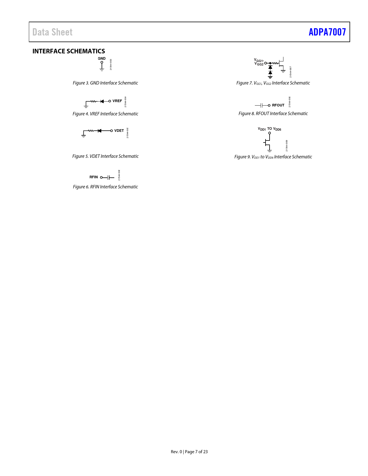 | Páginas / Página | 23 / 7 — Data Sheet. ADPA7007. INTERFACE SCHEMATICS. GND. VGG1,. VGG2. VREF. … |