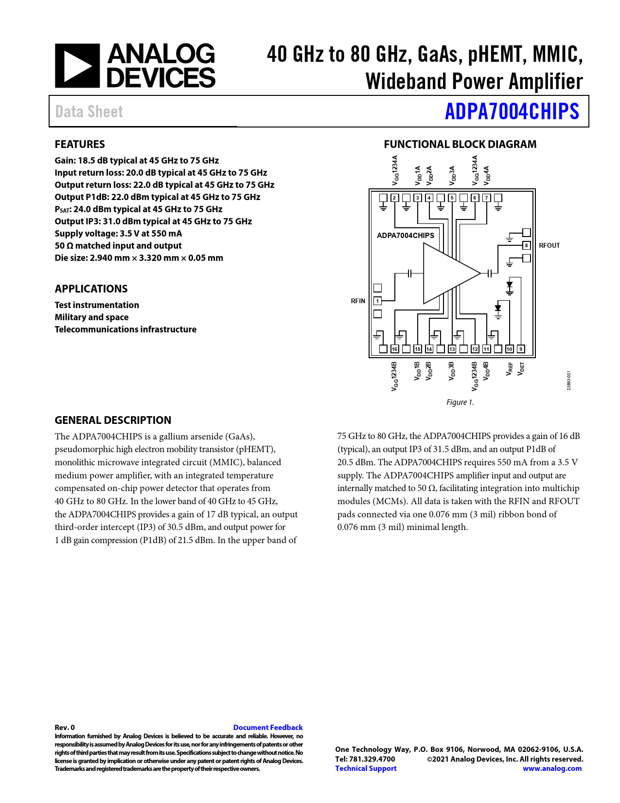 40 GHz to 80 GHz, GaAs, pHEMT, MMIC,. Wideband Power Amplifier. Data Sheet. ADPA7004CHIPS. FEATURES. FUNCTIONAL BLOCK DIAGRAM