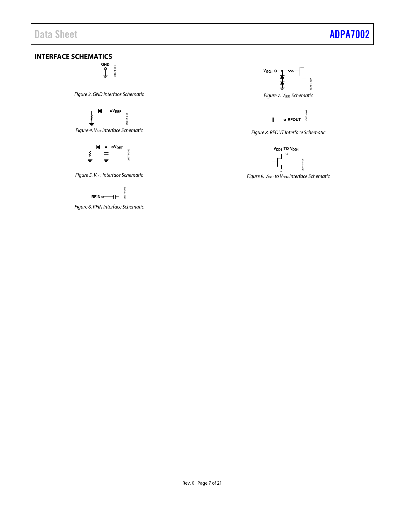 Páginas / Página21 / 7 — Data Sheet. ADPA7002. INTERFACE SCHEMATICS. GND. VGG1. VREF. RFOUT. VDET. …