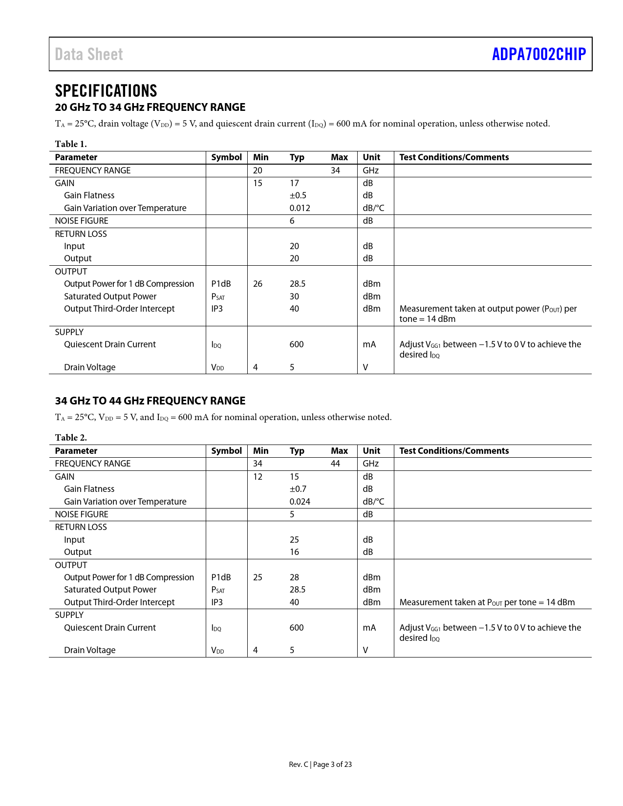 Páginas / Página23 / 3 — Data Sheet. ADPA7002CHIP. SPECIFICATIONS 20 GHz TO 34 GHz FREQUENCY …