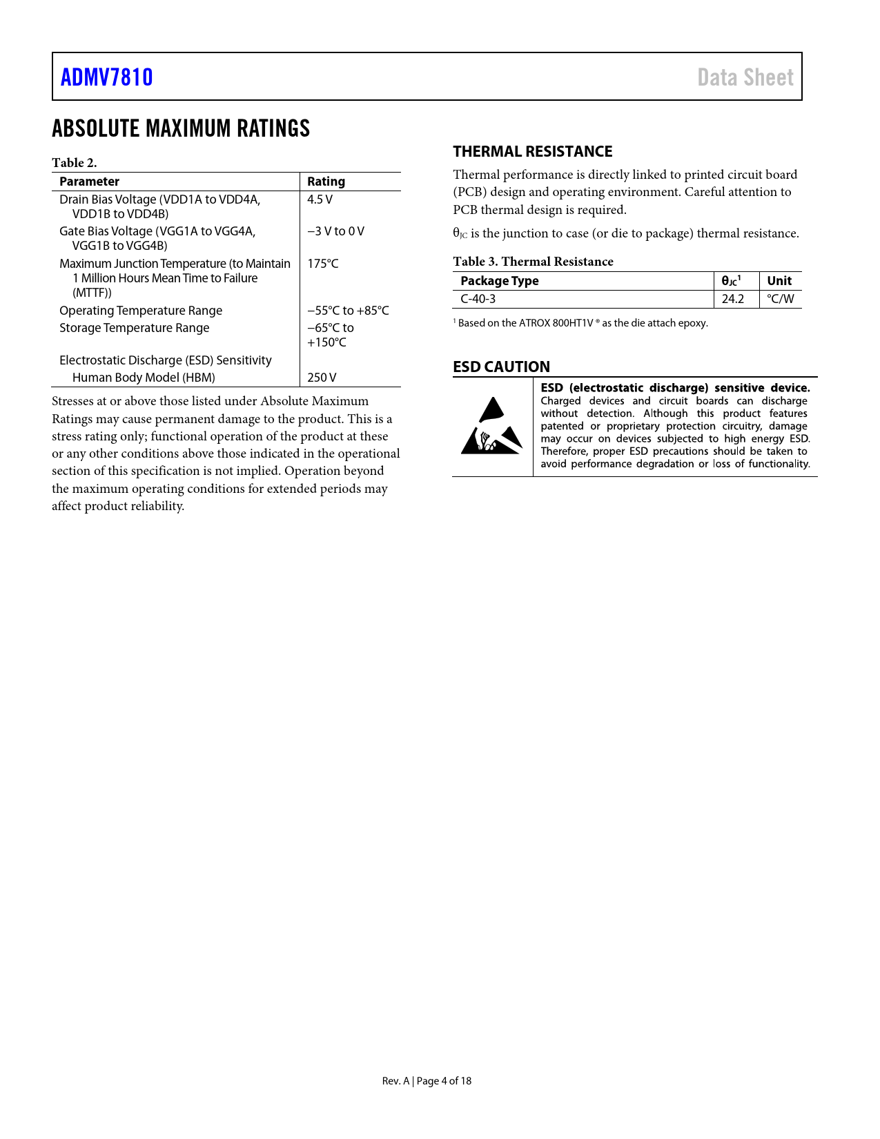 Páginas / Página18 / 4 — ADMV7810. Data Sheet. ABSOLUTE MAXIMUM RATINGS. THERMAL RESISTANCE. Table …