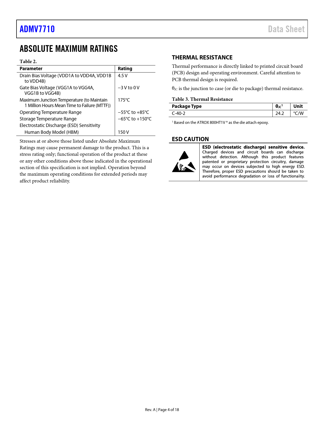 Páginas / Página18 / 4 — ADMV7710. Data Sheet. ABSOLUTE MAXIMUM RATINGS. THERMAL RESISTANCE. Table …