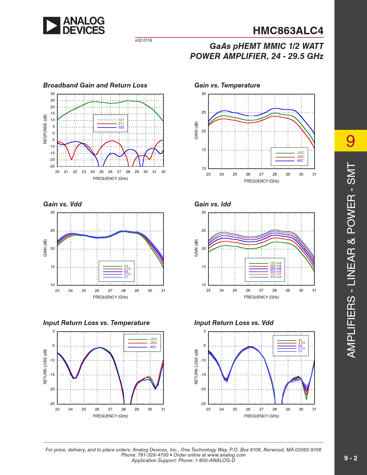 HMC863ALC4 v02.0118 GaAs pHEMT MMIC 1/2 WATTPOWER AMPLIFIER, 24 - 29.5 GHzBroadband Gain and Return LossGain vs. Temperature 30 30 25 20 15 25 B) (d 10 S21 ) S11 B SE 5 S22 d N ( 20 0 IN A ESPO -5 G R -10 9 15 -15 +25C +85C -20 -40C -25 10 T 20 21 22 23 24 25 26 27 28 29 30 31 32 23 24 25 26 27 28 29 30 31 FREQUENCY (GHz) M FREQUENCY (GHz) R - S Gain vs. VddGain vs. Idd E 30 30 W O 25 25 ) B B d d ( 20 IN 20 IN A A G G R & P 150 mA A 15 4V 15 200 mA 4.5V 250 mA E 5V 300 mA 5.5V 350 mA 6V 400 mA IN 10 10 23 24 25 26 27 28 29 30 31 23 24 25 26 27 28 29 30 31 FREQUENCY (GHz) FREQUENCY (GHz) S - L R IE Input Return Loss vs. TemperatureInput Return Loss vs. Vdd 0 0 LIF +25C 4V +85C 4.5V P -5 -40C -5 5V ) 5.5V ) B B 6V M (d (d S S A -10 S -10 S O O L L N N -15 UR -15 UR T T RE RE -20 -20 -25 -25 23 24 25 26 27 28 29 30 31 23 24 25 26 27 28 29 30 31 FREQUENCY (GHz) FREQUENCY (GHz) For price, delivery, and to place orders: Analog Devices, Inc., One Technology Way, P.O. Box 9106, Norwood, MA 02062-9106 Phone: 781-329-4700 • Order online at www.analog.com Application Support: Phone: 1-800-ANALOG-D 9 - 2 Document Outline Typical Applications Features Functional Diagram General Description Electrical Specifications Gain & Return Loss Absolute Maximum Ratings Outline Drawing Package Information Pin Descriptions Evaluation PCB List of Materials Application Circuit