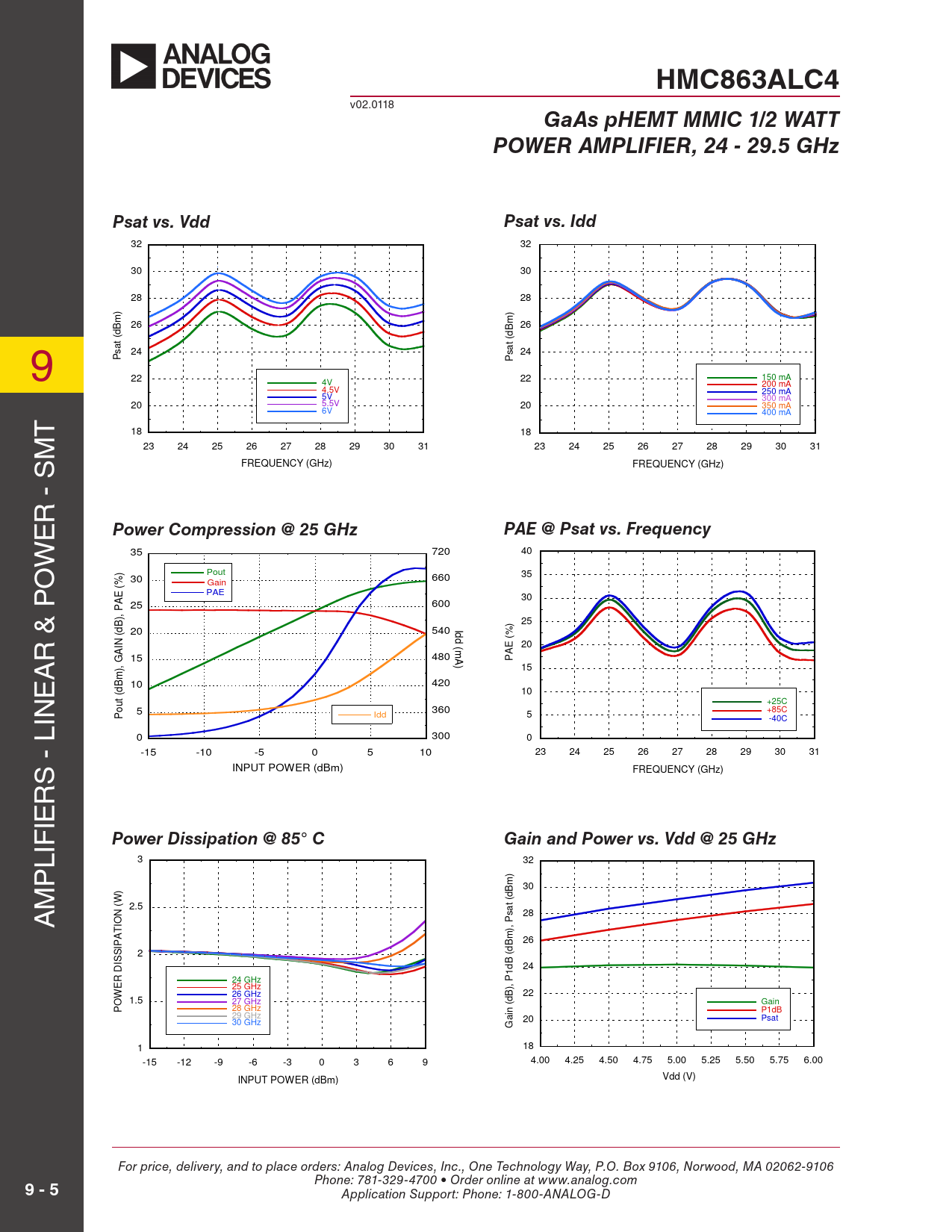 HMC863ALC4 v02.0118 GaAs pHEMT MMIC 1/2 WATTPOWER AMPLIFIER, 24 - 29.5 GHzPsat vs. VddPsat vs. Idd 32 32 30 30 28 28 ) m m 26 26 (dB (dB 9 at at s 24 s 24 P P 22 22 150 mA 4V 200 mA 4.5V 250 mA 5V 300 mA 20 5.5V 20 350 mA T 6V 400 mA 18 18 M 23 24 25 26 27 28 29 30 31 23 24 25 26 27 28 29 30 31 FREQUENCY (GHz) FREQUENCY (GHz) R - S E Power Compression @ 25 GHzPAE @ Psat vs. Frequency W 720 40 35 O Pout 35 30 660 Gain (%) PAE E 30 A 25 600 ), P 25 B ) I 20 540 d (d d R & P (% IN ( 20 m A GA 15 480 A PAE ) ), 15 E m B 10 420 (d 10 t IN +25C u o 5 360 P Idd 5 +85C -40C 0 300 0 -15 -10 -5 0 5 10 23 24 25 26 27 28 29 30 31 S - L INPUT POWER (dBm) FREQUENCY (GHz) R IE Power Dissipation @ 85° CGain and Power vs. Vdd @ 25 GHz LIF 3 32 P ) m M ) 30 (dB A (W 2.5 at N s 28 IO ), P m PAT 26 2 (dB ISSI 24 D 1dB 24 GHz ER 25 GHz ), P W 26 GHz 22 1.5 27 GHz (dB Gain PO 28 GHz n P1dB 29 GHz ai Psat 30 GHz 20 G 1 18 -15 -12 -9 -6 -3 0 3 6 9 4.00 4.25 4.50 4.75 5.00 5.25 5.50 5.75 6.00 INPUT POWER (dBm) Vdd (V) For price, delivery, and to place orders: Analog Devices, Inc., One Technology Way, P.O. Box 9106, Norwood, MA 02062-9106 Phone: 781-329-4700 • Order online at www.analog.com 9 - 5 Application Support: Phone: 1-800-ANALOG-D Document Outline Typical Applications Features Functional Diagram General Description Electrical Specifications Gain & Return Loss Absolute Maximum Ratings Outline Drawing Package Information Pin Descriptions Evaluation PCB List of Materials Application Circuit