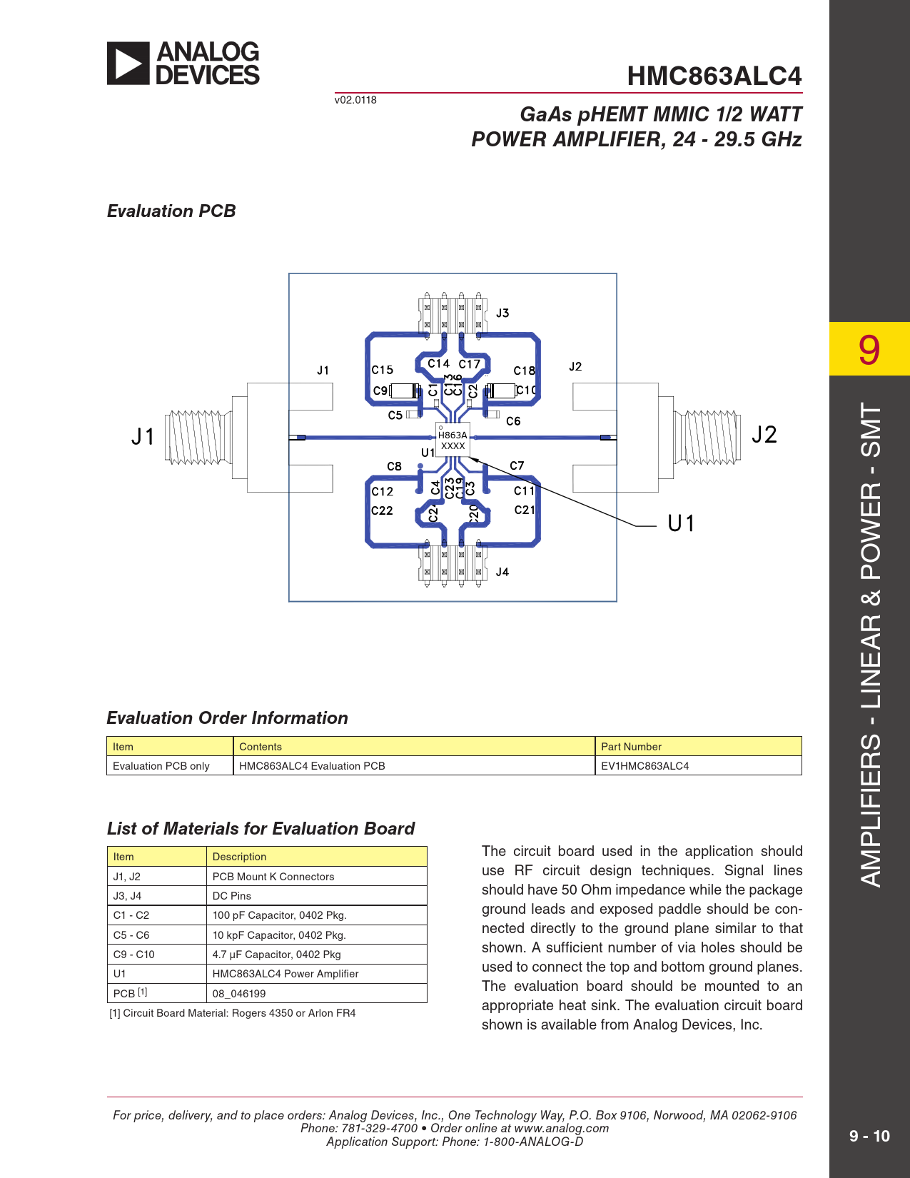 HMC863ALC4 GaAs pHEMT MMIC 1/2 WATT POWER AMPLIFIER, 24 - 29.5 GHz Evaluation PCB Evaluation Order Information