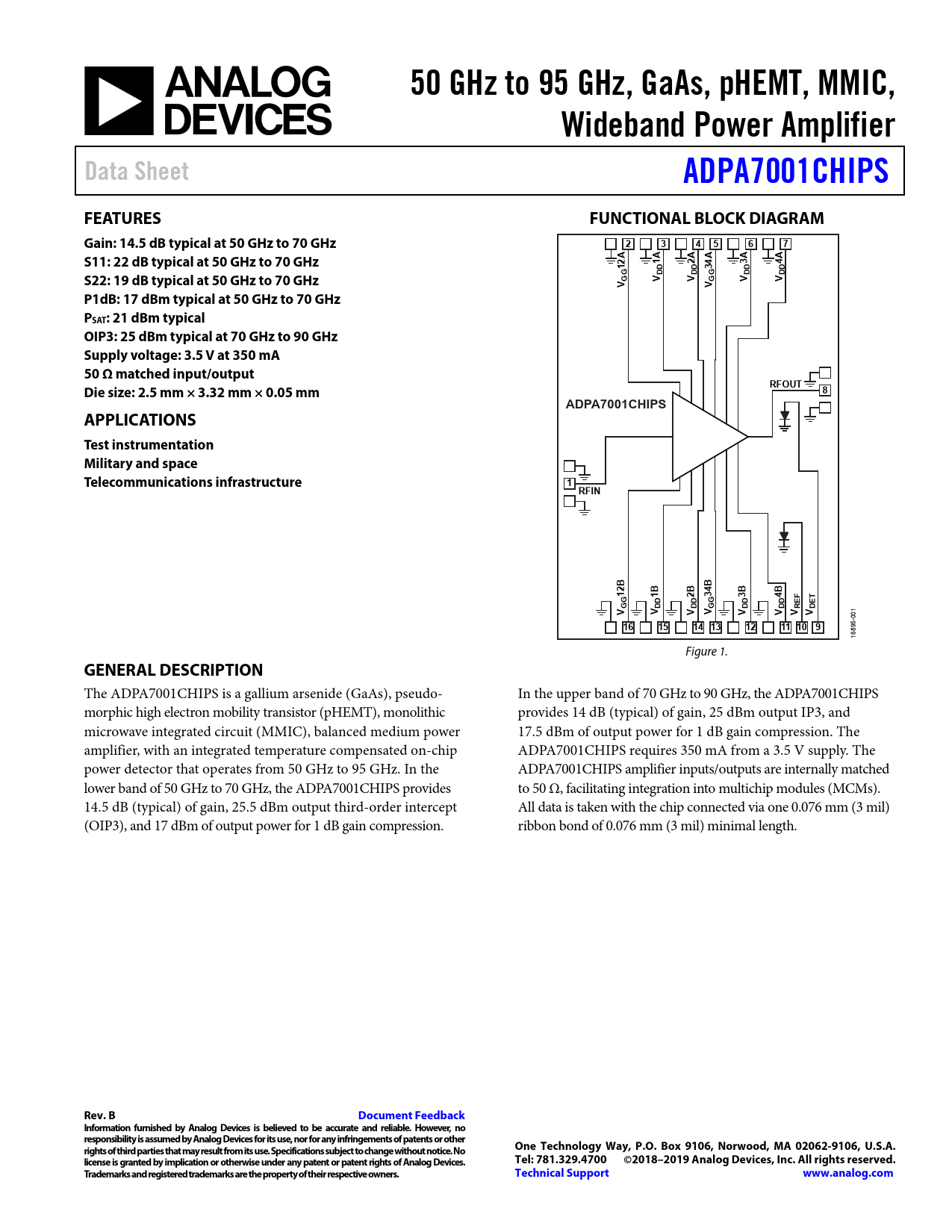 50 GHz to 95 GHz, GaAs, pHEMT, MMIC,. Wideband Power Amplifier. Data Sheet. ADPA7001CHIPS. FEATURES. FUNCTIONAL BLOCK DIAGRAM