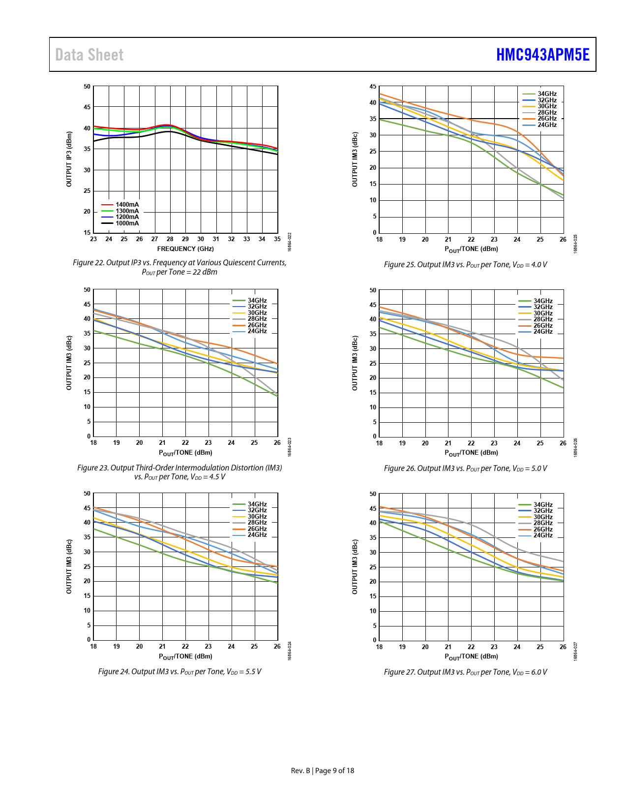 Data SheetHMC943APM5E504534GHz32GHz404530GHz28GHz3526GHz4024GHz30dBm)dBc)353 (25IP3 (IM20PUT30PUTUTUTOO1525101400mA201300mA1200mA51000mA15023242526272829303132333435 022 181920212223242526 025 FREQUENCY (GHz) 16864- POUT/TONE (dBm) 16864- Figure 22. Output IP3 vs. Frequency at Various Quiescent Currents, Figure 25. Output IM3 vs. POUT per Tone, VDD = 4.0 V POUT per Tone = 22 dBm 50504534GHz34GHz32GHz4532GHz30GHz30GHz4028GHz4028GHz26GHz26GHz3524GHz3524GHzdBc)30dBc)303 (3 (IM25IM25PUT20PUT20UTUTO15O1510105500181920212223242526 023 181920212223242526 026 POUT/TONE (dBm)P 16864- OUT/TONE (dBm) 16864- Figure 23. Output Third-Order Intermodulation Distortion (IM3) Figure 26. Output IM3 vs. POUT per Tone, VDD = 5.0 V vs. POUT per Tone, VDD = 4.5 V 50504534GHz34GHz32GHz4532GHz30GHz30GHz4028GHz4028GHz26GHz26GHz3524GHz3524GHzdBc)30dBc)303 (3 (IM25IM25PUT20PUT20UTUTO15O1510105500181920212223242526 024 181920212223242526 027 POUT/TONE (dBm)P 16864- OUT/TONE (dBm) 16864- Figure 24. Output IM3 vs. POUT per Tone, VDD = 5.5 V Figure 27. Output IM3 vs. POUT per Tone, VDD = 6.0 V Rev. B | Page 9 of 18 Document Outline FEATURES APPLICATIONS FUNCTIONAL BLOCK DIAGRAM GENERAL DESCRIPTION TABLE OF CONTENTS REVISION HISTORY SPECIFICATIONS ELECTRICAL SPECIFICATIONS ABSOLUTE MAXIMUM RATINGS THERMAL RESISTANCE ESD CAUTION PIN CONFIGURATION AND FUNCTION DESCRIPTIONS INTERFACE SCHEMATICS TYPICAL PERFORMANCE CHARACTERISTICS THEORY OF OPERATION APPLICATIONS INFORMATION POWER DETECTION EVALUATION BOARD EVALUATION BOARD SCHEMATIC OUTLINE DIMENSIONS ORDERING GUIDE