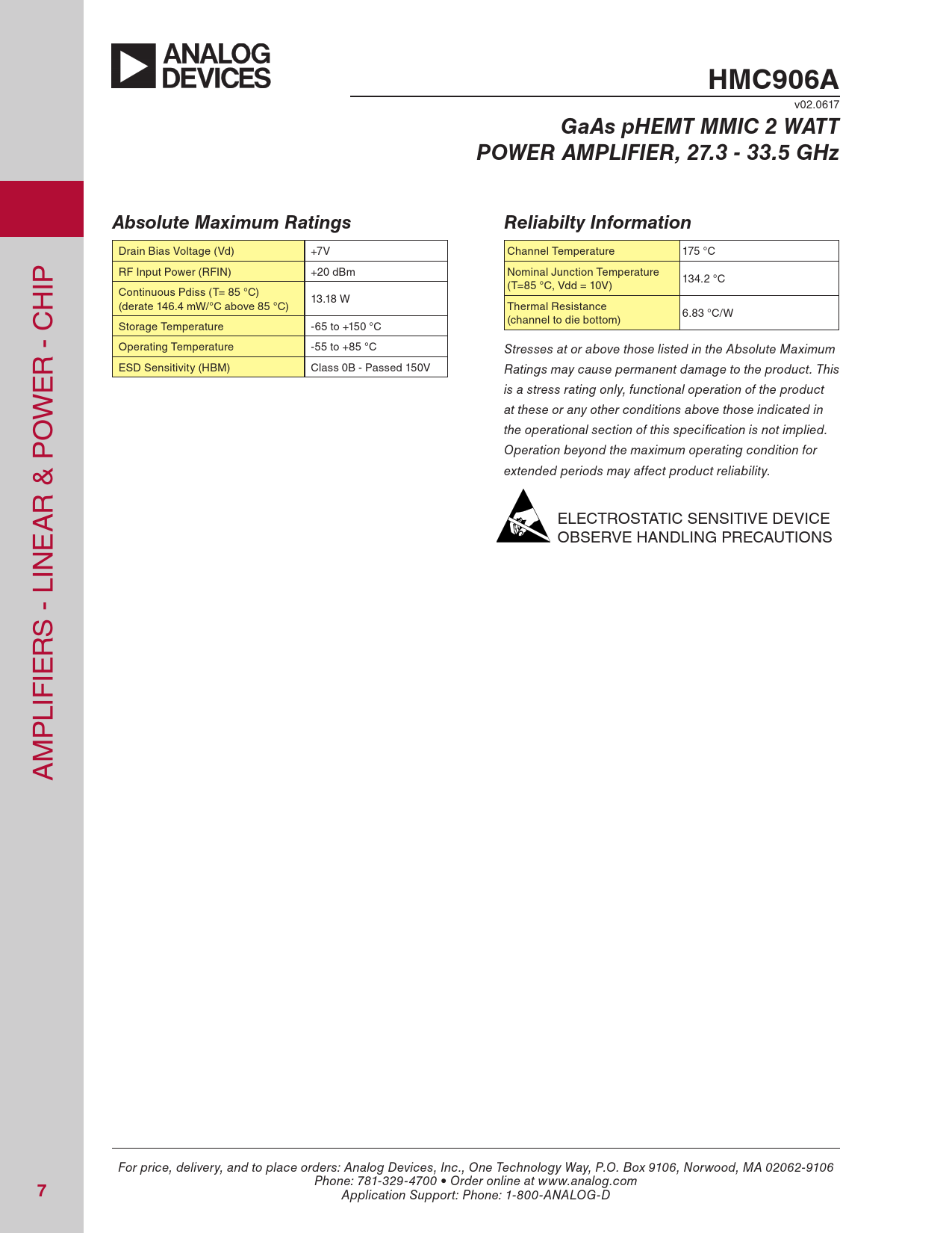 HMC906A. GaAs pHEMT MMIC 2 WATT. POWER AMPLIFIER, 27.3 - 33.5 GHz. Absolute Maximum Ratings. Reliabilty Information