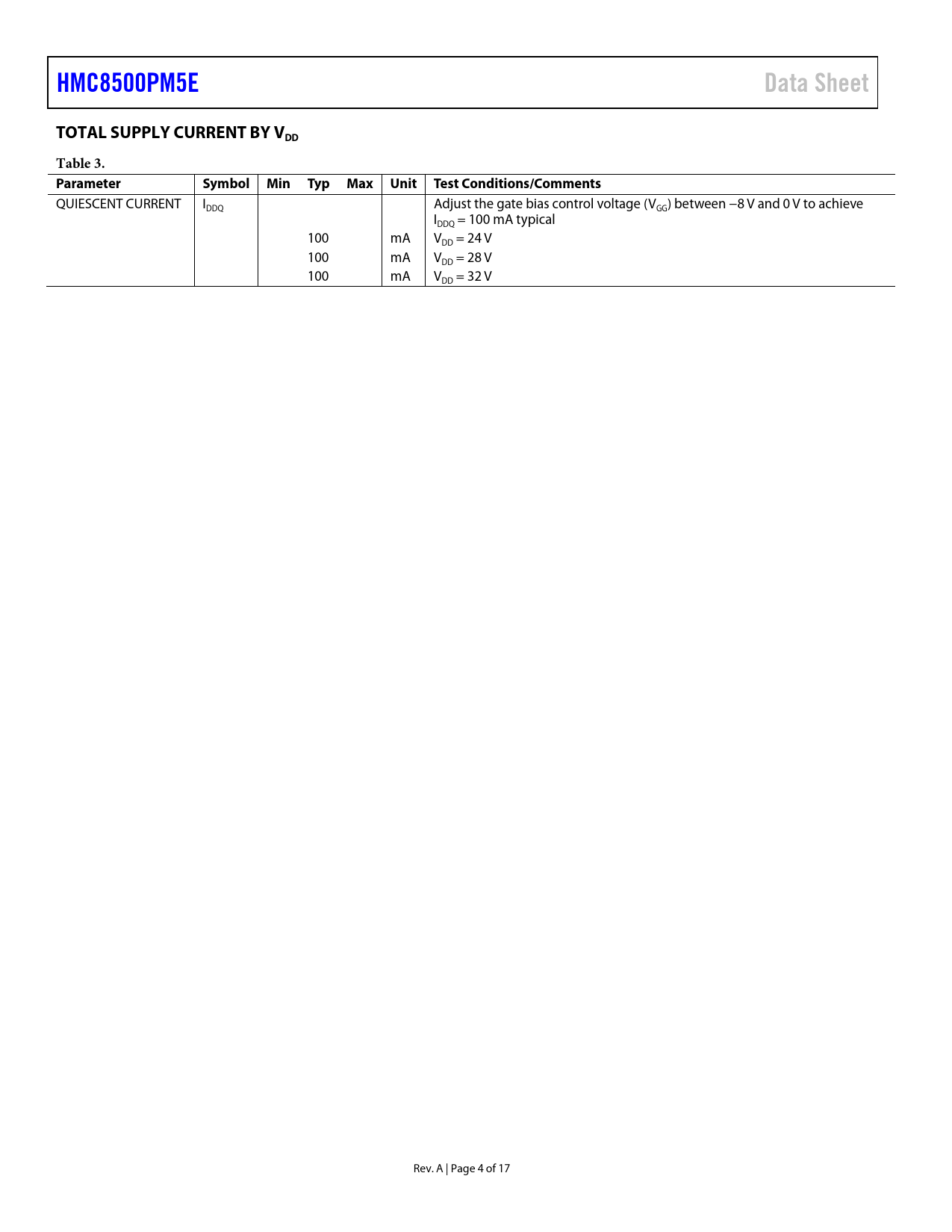 Páginas / Página17 / 4 — HMC8500PM5E. Data Sheet. TOTAL SUPPLY CURRENT BY VDD. Table 3. Parameter. …
