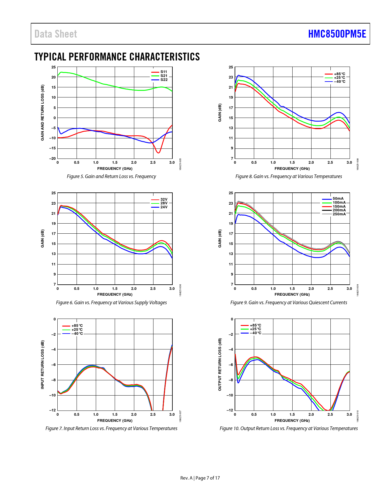 Data SheetHMC8500PM5ETYPICAL PERFORMANCE CHARACTERISTICS2525S11+85°C20S2123+25°CS22–40°CB)1521d ( S S1019O5B)17dURN L TN (0AI15G–513N AND RE AI–10G11–159–20700.51.01.52.02.53.0 005 00.51.01.52.02.53.0 008 FREQUENCY (GHz) 16825- FREQUENCY (GHz) 16825- Figure 5. Gain and Return Loss vs. Frequency Figure 8. Gain vs. Frequency at Various Temperatures 252532V50mA2328V23100mA24V150mA 200mA2121250mA1919B)17B)d17dN (N (AI15AI15GG13131111997700.51.01.52.02.53.0 006 00.51.01.52.02.53.0 009 FREQUENCY (GHz) 16825- FREQUENCY (GHz) 16825- Figure 6. Gain vs. Frequency at Various Supply Voltages Figure 9. Gain vs. Frequency at Various Quiescent Currents 00+85°C+85°C+25°C+25°C–2–40°C–2–40°CB)B)dd((–4SS–4SSOO–6URN L–6URN LTTRERE–8UTUT–8PINPUT O–10–10–12–1200.51.01.52.02.53.0 007 00.51.01.52.02.53.0 010 FREQUENCY (GHz) 16825- FREQUENCY (GHz) 16825- Figure 7. Input Return Loss vs. Frequency at Various Temperatures Figure 10. Output Return Loss vs. Frequency at Various Temperatures Rev. A | Page 7 of 17 Document Outline Features Applications Functional Block Diagram General Description Revision History Specifications Electrical Specifications Total Supply Current by VDD Absolute Maximum Ratings Thermal Resistance ESD Caution Pin Configuration and Function Descriptions Interface Schematics Typical Performance Characteristics Theory of Operation Applications Information Evaluation Board Outline Dimensions Ordering Guide