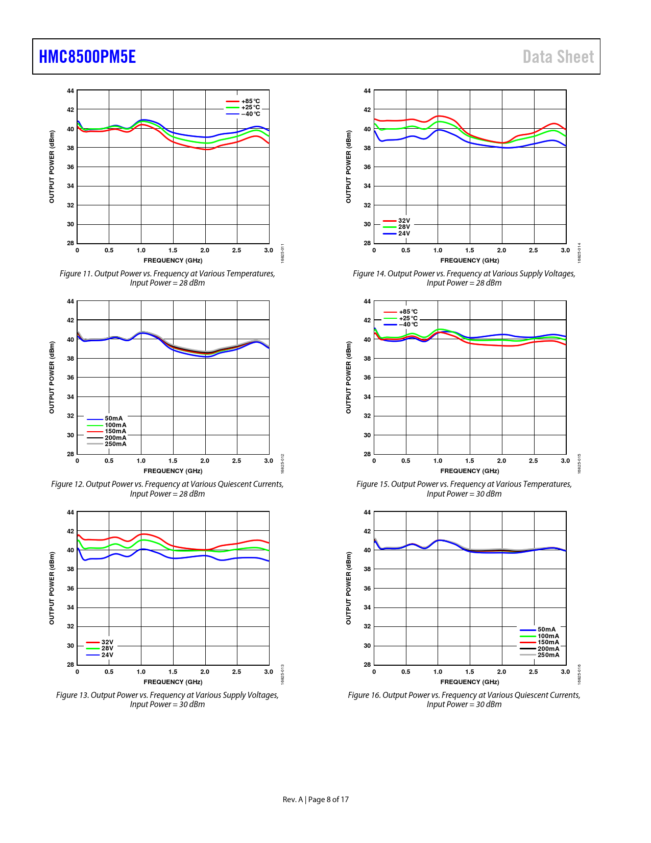 HMC8500PM5EData Sheet4444+85°C42+25°C42–40°C4040Bm)Bm)dd3838R (R (EEWW36O36OPPUT34UTP34PUTUTOO323232V303028V 24V28 1 28 1 00.51.01.52.02.53.0 0 00.51.01.52.02.53.0 014 FREQUENCY (GHz) 16825- FREQUENCY (GHz) 16825- Figure 11. Output Power vs. Frequency at Various Temperatures, Figure 14. Output Power vs. Frequency at Various Supply Voltages, Input Power = 28 dBm Input Power = 28 dBm 4444+85°C4242+25°C –40°C4040Bm)Bm)dd3838R (R (EEWW36O36OPPUT34UTP34PUTUTOO3250mA32100mA 150mA30200mA30250mA282800.51.01.52.02.53.0 012 00.51.01.52.02.53.0 015 FREQUENCY (GHz) 16825- FREQUENCY (GHz) 16825- Figure 12. Output Power vs. Frequency at Various Quiescent Currents, Figure 15. Output Power vs. Frequency at Various Temperatures, Input Power = 28 dBm Input Power = 30 dBm 444442424040Bm)Bm)dd3838R (R (EEWW36O36OPPUT34UTP34PUTUTOO323250mA 100mA32V150mA3028V30200mA24V250mA282800.51.01.52.02.53.0 013 00.51.01.52.02.53.0 016 FREQUENCY (GHz) 16825- FREQUENCY (GHz) 16825- Figure 13. Output Power vs. Frequency at Various Supply Voltages, Figure 16. Output Power vs. Frequency at Various Quiescent Currents, Input Power = 30 dBm Input Power = 30 dBm Rev. A | Page 8 of 17 Document Outline Features Applications Functional Block Diagram General Description Revision History Specifications Electrical Specifications Total Supply Current by VDD Absolute Maximum Ratings Thermal Resistance ESD Caution Pin Configuration and Function Descriptions Interface Schematics Typical Performance Characteristics Theory of Operation Applications Information Evaluation Board Outline Dimensions Ordering Guide