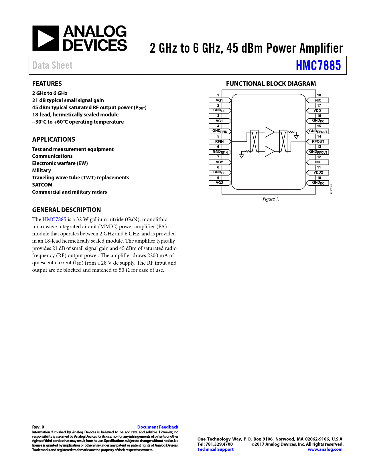 2 GHz to 6 GHz, 45 dBm Power Amplifier. Data Sheet. HMC7885. FEATURES. FUNCTIONAL BLOCK DIAGRAM. 2 GHz to 6 GHz