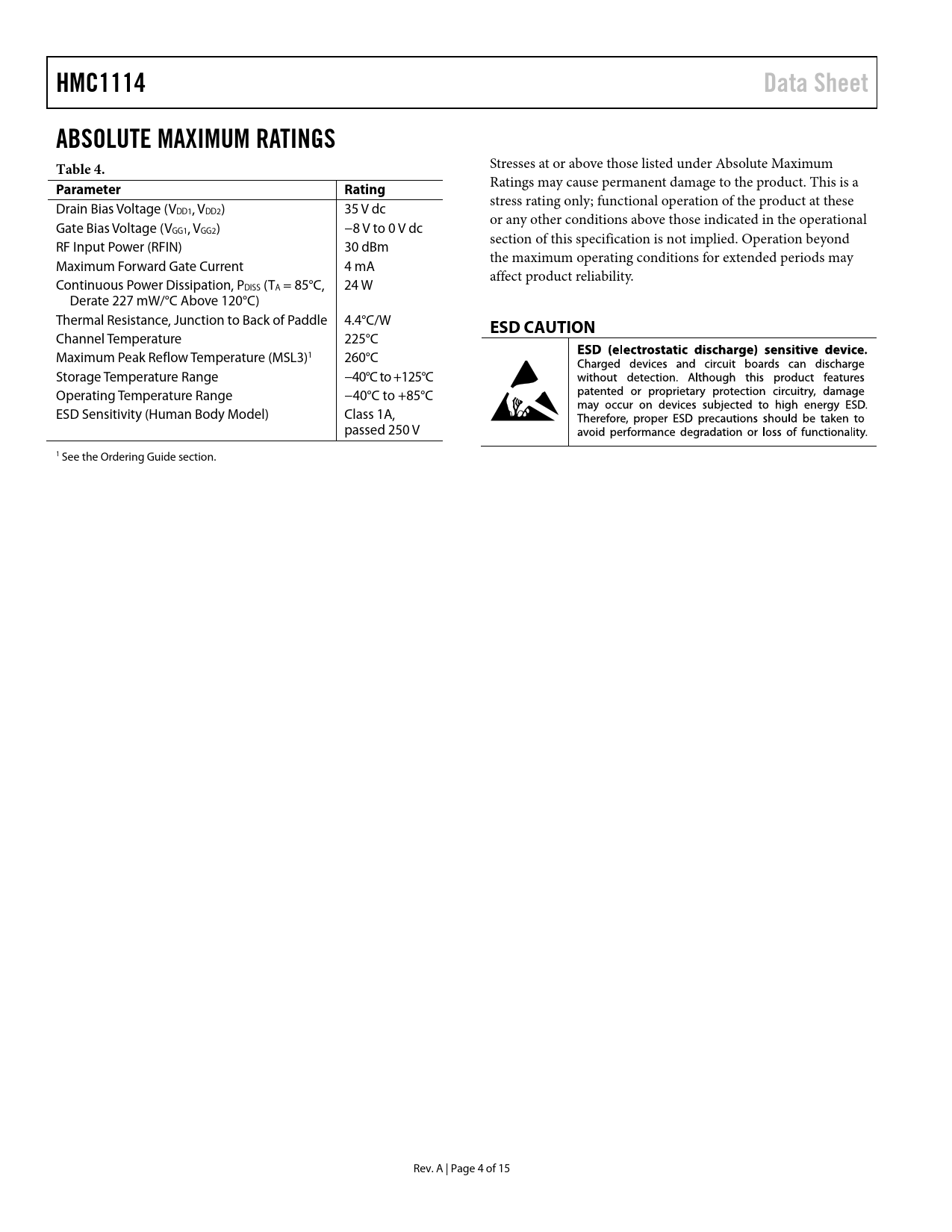 link to page 15 HMC1114Data SheetABSOLUTE MAXIMUM RATINGS Table 4. Stresses at or above those listed under Absolute Maximum ParameterRating Ratings may cause permanent damage to the product. This is a stress rating only; functional operation of the product at these Drain Bias Voltage (VDD1, VDD2) 35 V dc or any other conditions above those indicated in the operational Gate Bias Voltage (VGG1, VGG2) −8 V to 0 V dc section of this specification is not implied. Operation beyond RF Input Power (RFIN) 30 dBm the maximum operating conditions for extended periods may Maximum Forward Gate Current 4 mA affect product reliability. Continuous Power Dissipation, PDISS (TA = 85°C, 24 W Derate 227 mW/°C Above 120°C) Thermal Resistance, Junction to Back of Paddle 4.4°C/W ESD CAUTION Channel Temperature 225°C Maximum Peak Reflow Temperature (MSL3)1 260°C Storage Temperature Range −40°C to +125°C Operating Temperature Range −40°C to +85°C ESD Sensitivity (Human Body Model) Class 1A, passed 250 V 1 See the Ordering Guide section. Rev. A | Page 4 of 15 Document Outline FEATURES APPLICATIONS FUNCTIONAL BLOCK DIAGRAM GENERAL DESCRIPTION TABLE OF CONTENTS REVISION HISTORY SPECIFICATIONS ELECTRICAL SPECIFICATIONS TOTAL SUPPLY CURRENT BY VDD ABSOLUTE MAXIMUM RATINGS ESD CAUTION PIN CONFIGURATION AND FUNCTION DESCRIPTIONS INTERFACE SCHEMATICS TYPICAL PERFORMANCE CHARACTERISTICS THEORY OF OPERATION APPLICATIONS INFORMATION RECOMMENDED BIAS SEQUENCE During Power-Up During Power-Down TYPICAL APPLICATION CIRCUIT EVALUATION PRINTED CIRCUIT BOARD (PCB) BILL OF MATERIALS OUTLINE DIMENSIONS ORDERING GUIDE