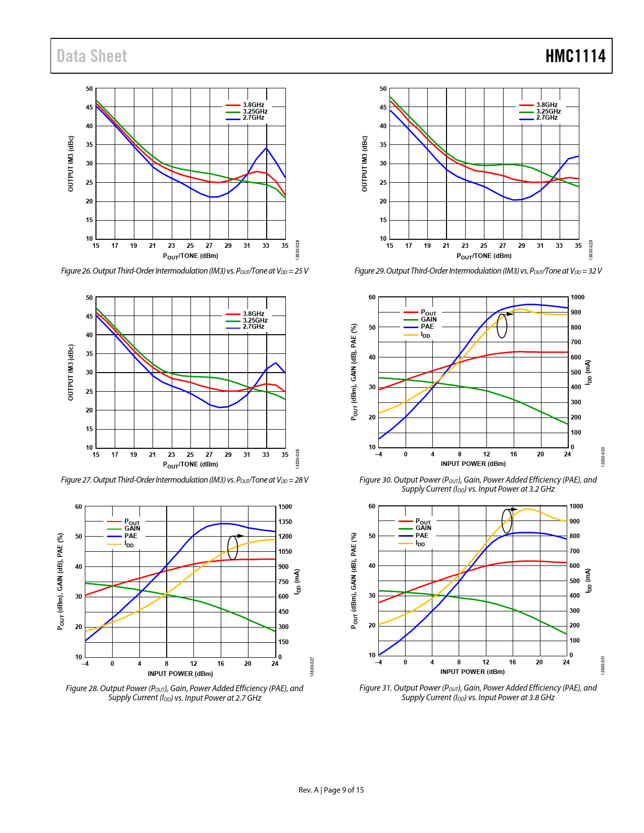 Data SheetHMC11145050453.8GHz3.8GHz3.25GHz453.25GHz2.7GHz2.7GHz404035dBc)35dBc)3 (3 (IM30IM30PUTPUT25UT25UTOO2020151510101517192123252729313335 028 1517192123252729313335 029 POUT/TONE (dBm)P 13530- OUT/TONE (dBm) 13530- Figure 26. Output Third-Order Intermodulation (IM3) vs. POUT/Tone at VDD = 25 V Figure 29. Output Third-Order Intermodulation (IM3) vs. POUT/Tone at VDD = 32 V 50601000453.8GHzPOUT9003.25GHzGAIN2.7GHz50PAE80040(%)IDDAE70035, PdBc)406003 (dB)IM30N (500AI(mA)PUT, GI DD2530400UT O(dBm)30020UTPO 2020015100101001517192123252729313335 026 –404812162024 030 POUT/TONE (dBm)INPUT POWER (dBm) 13530- 13530- Figure 27. Output Third-Order Intermodulation (IM3) vs. POUT/Tone at VDD = 28 V Figure 30. Output Power (POUT), Gain, Power Added Efficiency (PAE), and Supply Current (IDD) vs. Input Power at 3.2 GHz 601500601000POUT1350POUT900GAINGAIN50PAE120050PAE800(%)IDD(%)IDDAE1050AE700, P, P40900dB)40600dB)N (N (750AI(mA)500AI(mA), GI DD, GI DD3060030400(dBm)450(dBm)300UTUTP O20300P O20200150100100100–404812162024 027 –404812162024 031 INPUT POWER (dBm)INPUT POWER (dBm) 13530- 13530- Figure 28. Output Power (POUT), Gain, Power Added Efficiency (PAE), and Figure 31. Output Power (POUT), Gain, Power Added Efficiency (PAE), and Supply Current (IDD) vs. Input Power at 2.7 GHz Supply Current (IDD) vs. Input Power at 3.8 GHz Rev. A | Page 9 of 15 Document Outline FEATURES APPLICATIONS FUNCTIONAL BLOCK DIAGRAM GENERAL DESCRIPTION TABLE OF CONTENTS REVISION HISTORY SPECIFICATIONS ELECTRICAL SPECIFICATIONS TOTAL SUPPLY CURRENT BY VDD ABSOLUTE MAXIMUM RATINGS ESD CAUTION PIN CONFIGURATION AND FUNCTION DESCRIPTIONS INTERFACE SCHEMATICS TYPICAL PERFORMANCE CHARACTERISTICS THEORY OF OPERATION APPLICATIONS INFORMATION RECOMMENDED BIAS SEQUENCE During Power-Up During Power-Down TYPICAL APPLICATION CIRCUIT EVALUATION PRINTED CIRCUIT BOARD (PCB) BILL OF MATERIALS OUTLINE DIMENSIONS ORDERING GUIDE