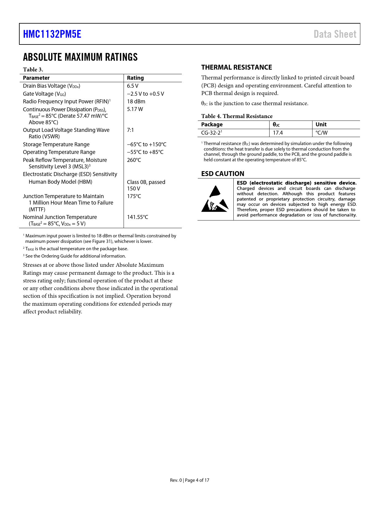 link to page 9 link to page 17 HMC1132PM5EData SheetABSOLUTE MAXIMUM RATINGS Table 3.THERMAL RESISTANCEParameterRating Thermal performance is directly linked to printed circuit board Drain Bias Voltage (VDDx) 6.5 V (PCB) design and operating environment. Careful attention to Gate Voltage (VGG) −2.5 V to +0.5 V PCB thermal design is required. Radio Frequency Input Power (RFIN)1 18 dBm θJC is the junction to case thermal resistance. Continuous Power Dissipation (PDISS), 5.17 W T 2 BASE = 85°C (Derate 57.47 mW/°C Table 4. Thermal Resistance Above 85°C) PackageθJCUnit Output Load Voltage Standing Wave 7:1 CG-32-21 17.4 °C/W Ratio (VSWR) Storage Temperature Range −65°C to +150°C 1 Thermal resistance (θJC) was determined by simulation under the following conditions: the heat transfer is due solely to thermal conduction from the Operating Temperature Range −55°C to +85°C channel, through the ground paddle, to the PCB, and the ground paddle is Peak Reflow Temperature, Moisture 260°C held constant at the operating temperature of 85°C. Sensitivity Level 3 (MSL3)3 Electrostatic Discharge (ESD) Sensitivity ESD CAUTION Human Body Model (HBM) Class 0B, passed 150 V Junction Temperature to Maintain 175°C 1 Million Hour Mean Time to Failure (MTTF) Nominal Junction Temperature 141.55°C (T 2 BASE = 85°C, VDDx = 5 V) 1 Maximum input power is limited to 18 dBm or thermal limits constrained by maximum power dissipation (see Figure 31), whichever is lower. 2 TBASE is the actual temperature on the package base. 3 See the Ordering Guide for additional information. Stresses at or above those listed under Absolute Maximum Ratings may cause permanent damage to the product. This is a stress rating only; functional operation of the product at these or any other conditions above those indicated in the operational section of this specification is not implied. Operation beyond the maximum operating conditions for extended periods may affect product reliability. Rev. 0 | Page 4 of 17 Document Outline Features Applications Functional Block Diagram General Description Revision History Specifications Electrical Specifications Absolute Maximum Ratings Thermal Resistance ESD Caution Pin Configuration and Function Descriptions Interface Schematics Typical Performance Characteristics Theory of Operation Applications Information Application Circuit Evaluation Board Bill of Materials Evaluation Board Schematic Outline Dimensions Ordering Guide