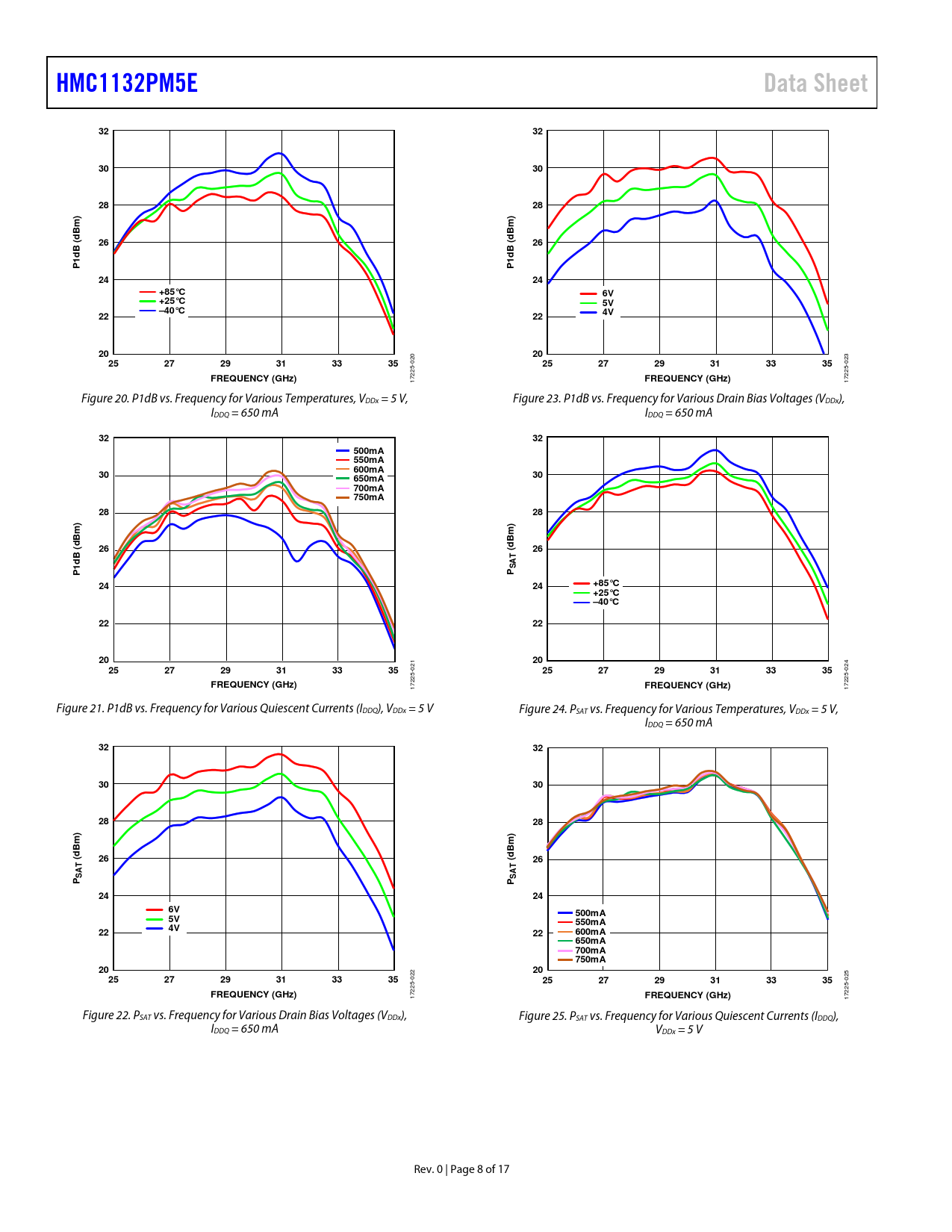 HMC1132PM5EData Sheet323230302828Bm)Bm)dd2626B (B (1d1dPP2424+85°C6V+25°C5V–40°C22224V2020252729313335 020 252729313335 023 FREQUENCY (GHz) 17225- FREQUENCY (GHz) 17225- Figure 20. P1dB vs. Frequency for Various Temperatures, VDDx = 5 V, Figure 23. P1dB vs. Frequency for Various Drain Bias Voltages (VDDx), IDDQ = 650 mA IDDQ = 650 mA 3232500mA 550mA 600mA30650mA30700mA 750mA2828Bm)Bm)dd26(26B (AT1dSPP2424+85°C +25°C –40°C22222020252729313335 021 252729313335 024 FREQUENCY (GHz) 17225- FREQUENCY (GHz) 17225- Figure 21. P1dB vs. Frequency for Various Quiescent Currents (IDDQ), VDDx = 5 V Figure 24. PSAT vs. Frequency for Various Temperatures, VDDx = 5 V, IDDQ = 650 mA 323230302828Bm)Bm)dd(26(26ATATSSPP24246V500mA5V550mA224V22600mA 650mA 700mA 750mA2020252729313335 022 252729313335 025 FREQUENCY (GHz) 17225- FREQUENCY (GHz) 17225- Figure 22. PSAT vs. Frequency for Various Drain Bias Voltages (VDDx), Figure 25. PSAT vs. Frequency for Various Quiescent Currents (IDDQ), IDDQ = 650 mA VDDx = 5 V Rev. 0 | Page 8 of 17 Document Outline Features Applications Functional Block Diagram General Description Revision History Specifications Electrical Specifications Absolute Maximum Ratings Thermal Resistance ESD Caution Pin Configuration and Function Descriptions Interface Schematics Typical Performance Characteristics Theory of Operation Applications Information Application Circuit Evaluation Board Bill of Materials Evaluation Board Schematic Outline Dimensions Ordering Guide