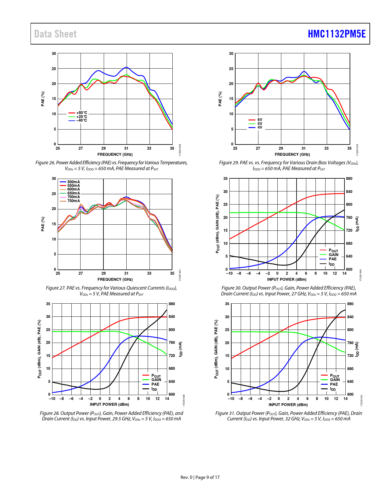17225- Figure 27. PAE vs. Frequency for Various Quiescent Currents (IDDQ), Figure 30. Output Power (POUT), Gain, Power Added Efficiency (PAE), VDDx = 5 V, PAE Measured at PSAT Drain Current (IDD) vs. Input Power, 27 GHz, VDDx = 5 V, IDDQ = 650 mA