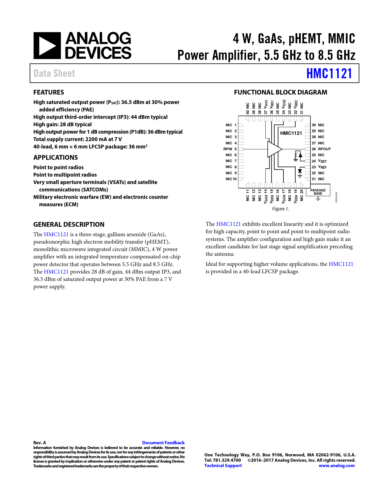 4 W, GaAs, pHEMT, MMIC. Power Amplifier, 5.5 GHz to 8.5 GHz. Data Sheet. HMC1121. FEATURES. FUNCTIONAL BLOCK DIAGRAM