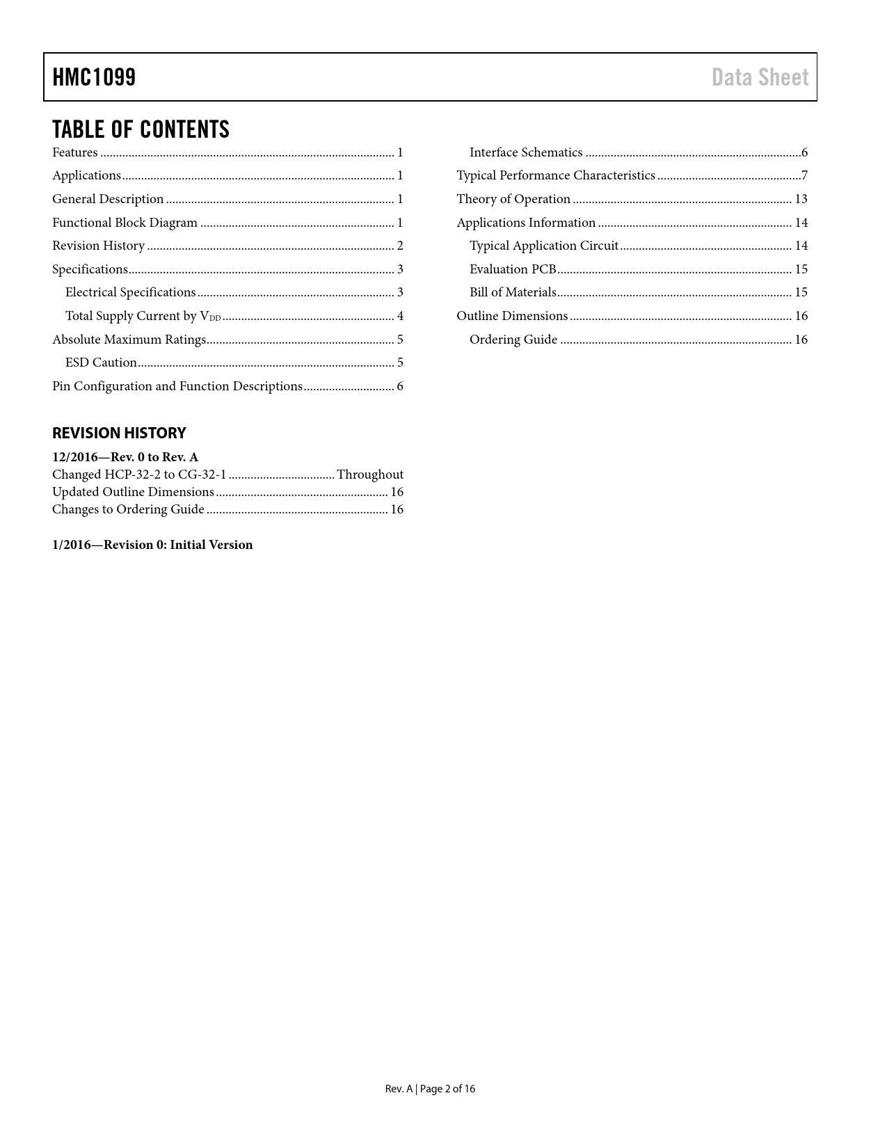 Páginas / Página16 / 2 — HMC1099. Data Sheet. TABLE OF CONTENTS. REVISION HISTORY 12/2016—Rev. 0 …