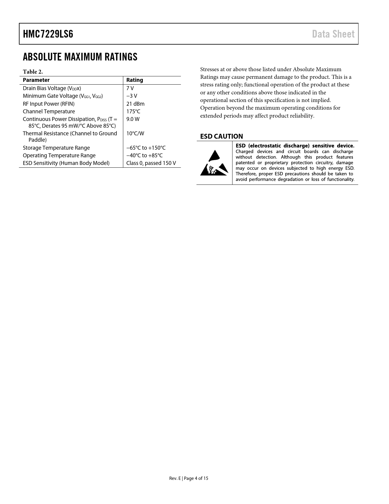 HMC7229LS6Data SheetABSOLUTE MAXIMUM RATINGSTable 2. Stresses at or above those listed under Absolute Maximum Ratings may cause permanent damage to the product. This is a Parameter Rating stress rating only; functional operation of the product at these Drain Bias Voltage (VDDx) 7 V or any other conditions above those indicated in the Minimum Gate Voltage (VGG1, VGG2) −3 V operational section of this specification is not implied. RF Input Power (RFIN) 21 dBm Operation beyond the maximum operating conditions for Channel Temperature 175°C extended periods may affect product reliability. Continuous Power Dissipation, PDISS (T = 9.0 W 85°C, Derates 95 mW/°C Above 85°C) Thermal Resistance (Channel to Ground 10°C/W ESD CAUTION Paddle) Storage Temperature Range −65°C to +150°C Operating Temperature Range −40°C to +85°C ESD Sensitivity (Human Body Model) Class 0, passed 150 V Rev. E | Page 4 of 15 Document Outline FEATURES APPLICATIONS FUNCTIONAL BLOCK DIAGRAM GENERAL DESCRIPTION REVISION HISTORY SPECIFICATIONS ELECTRICAL SPECIFICATIONS ABSOLUTE MAXIMUM RATINGS ESD CAUTION PIN CONFIGURATION AND FUNCTION DESCRIPTIONS INTERFACE SCHEMATICS TYPICAL PERFORMANCE CHARACTERISTICS THEORY OF OPERATION APPLICATIONS INFORMATION RECOMMENDED BIAS SEQUENCE During Power-Up During Power-Down EVALUATION PRINTED CIRCUIT BOARD (PCB) TYPICAL APPLICATION CIRCUIT OUTLINE DIMENSIONS ORDERING GUIDE