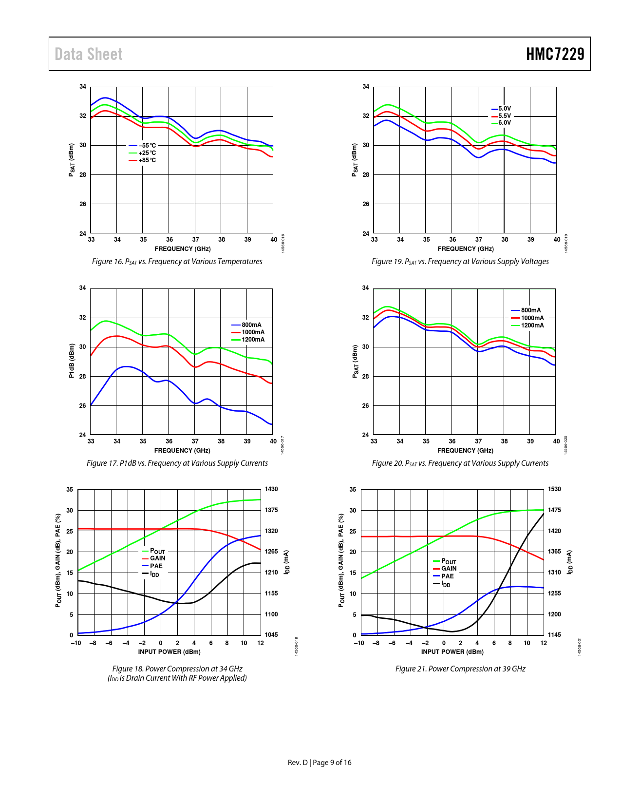 14566 14566- Figure 17. P1dB vs. Frequency at Various Supply Currents Figure 20. PSAT vs. Frequency at Various Supply Currents