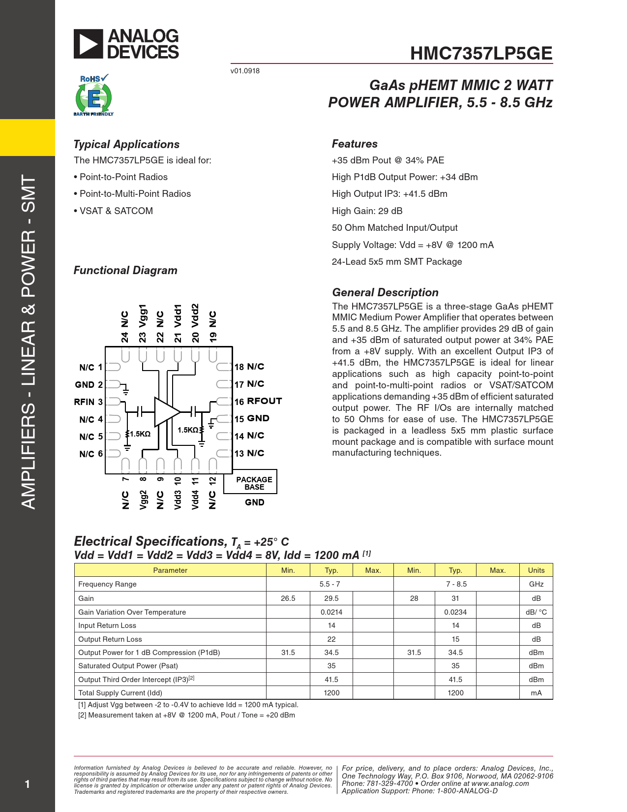 rights of third parties that may result from its use. Specifications subject to change without notice. No Phone: 781-329-4700 • Order online at www.analog.com license is granted by implication or otherwise under any patent or patent rights of Analog Devices. Trademarks and registered trademarks are the property of their respective owners. Application Support: Phone: 1-800-ANALOG-D Document Outline Typical Applications Features General Description Functional Diagram Electrical Specifications Gain & Return Loss Gain vs. Temperature Input Return Loss vs. Temperature Output Return Loss vs. Temperature P1dB vs. Temperature P1dB vs Supply Voltage Output IP3 vs. Supply Voltage, Pout/tone = +20 dBm Output IM3 @ Vdd = +6V Output IM3 @ Vdd =+7V Output IM3 @ Vdd = +8V Power Compression @ 6 GHz Power Compression @ 7 GHz Absolute Maximum Ratings Typical Supply Current vs. Vdd Outline Drawing Package Information Application Circuit List of Materials for Evaluation PCB EV1HMC7357LP5 [1] Evaluation PCB Pin Descriptions Gain & Power vs. Supply Current @ 7 GHz Gain & Power vs. Supply Voltage @ 7 GHz Power Compression @ 8 GHz Reverse Isolation vs. Temperature Output IP3 vs. Temperature, Pout/tone = +20 dBm Output IP3 vs. Supply Current, Pout/tone = +20 dBm P1dB vs. Supply Current Psat vs. Supply Current Psat vs. Temperature Psat vs. Supply Voltage