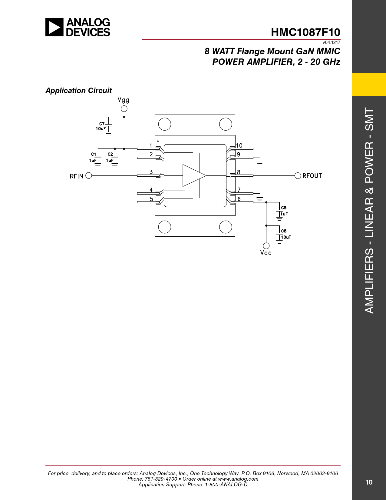 HMC1087F10 v04.1217 8 WATT Flange Mount GaN MMICPOWER AMPLIFIER, 2 - 20 GHzApplication Circuit T m s r - e w o p r & A e lin s - r ie lif p m A For price, delivery, and to place orders: Analog Devices, Inc., One Technology Way, P.O. Box 9106, Norwood, MA 02062-9106 Phone: 781-329-4700 • Order online at www.analog.com Application Support: Phone: 1-800-ANALOG-D 10 Document Outline Typical Applications Features Functional Diagram General Description Electrical Specifications Performance Characteristics Gain & Return Loss Gain vs. Temperature Input Return Loss vs. Temperature Output Return Loss vs. Temperature Low Frequency Gain & Return Loss Noise Figure vs. Frequency P1dB vs. Temperature Psat vs. Temperature P1dB vs. Vdd Psat vs. Vdd Output IP3 vs. Temperature @ Pout = 18 dBm Tone Power Compression @ 10 GHz Power Dissipation Second Harmonics vs. Temperature @ Pout = 18 dBm Second Harmonics vs. Vdd @ Pout = 18 dBm Second Harmonics vs. Pout Absolute Maximum Ratings Typical Supply Current vs. Vdd Outline Drawing Die Packaging Information Pad Descriptions Assembly Diagram Application Circuit