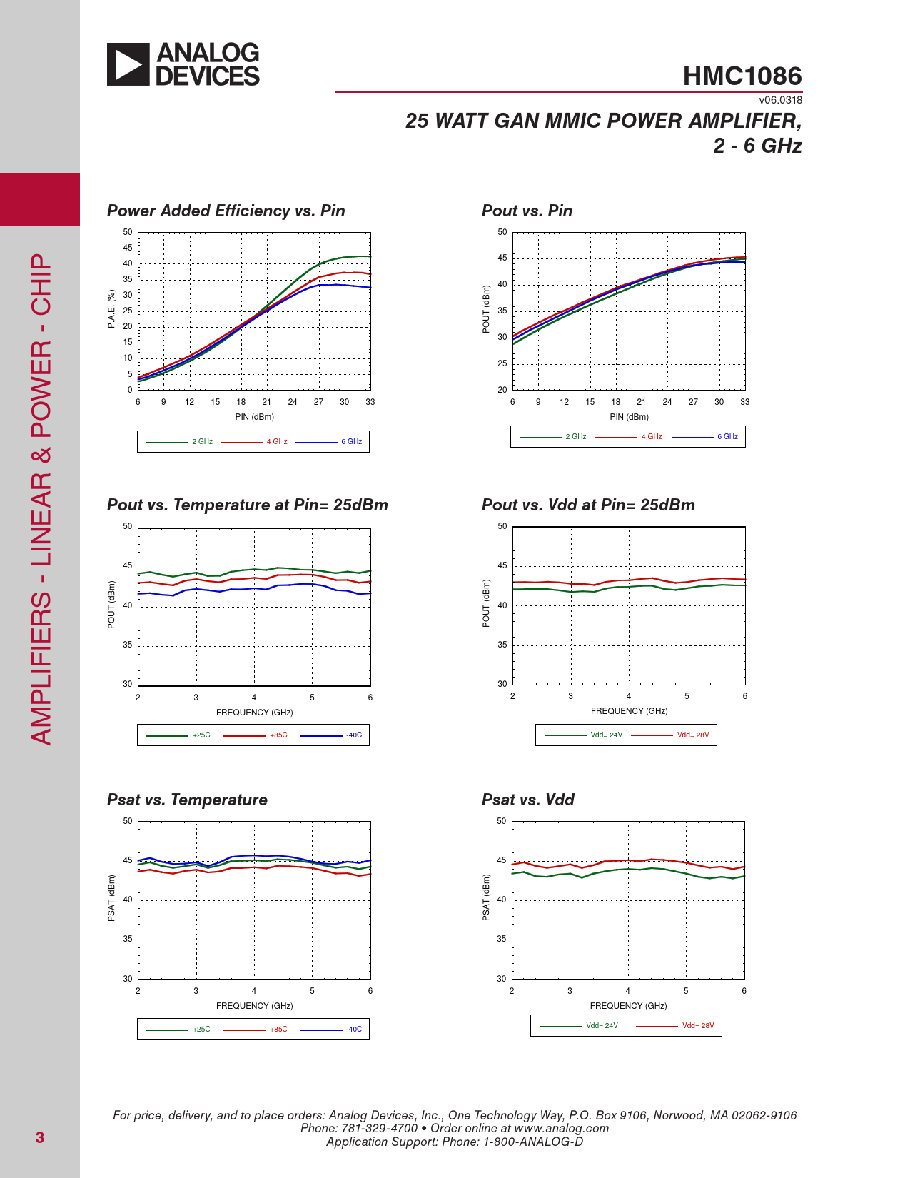 HMC1086 v06.0318 25 WATT GAN MMIC POWER AMPLIFIER,2 - 6 GHzPower Added Efficiency vs. PinPout vs. Pin 50 50 45 IP 45 40 H 35 ) 40 ) 30 % Bm . ( (d .E 25 T 35 .A U P 20 PO R - C 30 15 E 10 25 5 W 0 20 O 6 9 12 15 18 21 24 27 30 33 6 9 12 15 18 21 24 27 30 33 PIN (dBm) PIN (dBm) 2 GHz 4 GHz 6 GHz 2 GHz 4 GHz 6 GHz R & P A E Pout vs. Temperature at Pin= 25dBmPout vs. Vdd at Pin= 25dBm 50 50 IN 45 45 ) S - L Bm Bm (d R (d 40 T T 40 U U PO PO IE 35 35 LIF P 30 30 2 3 4 5 6 2 3 4 5 6 M FREQUENCY (GHz) FREQUENCY (GHz) A +25C +85C -40C Vdd= 24V Vdd= 28V Psat vs. TemperaturePsat vs. Vdd 50 50 45 45 ) Bm Bm (d 40 (d 40 PSAT PSAT 35 35 30 30 2 3 4 5 6 2 3 4 5 6 FREQUENCY (GHz) FREQUENCY (GHz) Vdd= 24V Vdd= 28V +25C +85C -40C For price, delivery, and to place orders: Analog Devices, Inc., One Technology Way, P.O. Box 9106, Norwood, MA 02062-9106 Phone: 781-329-4700 • Order online at www.analog.com 3 Application Support: Phone: 1-800-ANALOG-D Document Outline General Description Gain and Return Loss Gain vs. Vdd Input Return Loss Output Return Loss Pout vs. Frequency Power Gain vs. Frequency Power Added Efficiency vs. Pin Pout vs. Pin Pout vs. Temperature at Pin= 25dBm Pout vs. Vdd at Pin= 25dBm Psat vs. Temperature Psat vs. Vdd Drain Current vs. Pin OIP3 vs Pin/Tone IM3 vs. Pin/Tone Reverse Isolation Power Dissipation vs. Pin Second Harmonic vs. Pin Absolute Maximum Ratings[ Outline Drawing Pad Descriptions Application Circuit Assembly Diagram Mounting & Bonding Techniques for GaN MMICs