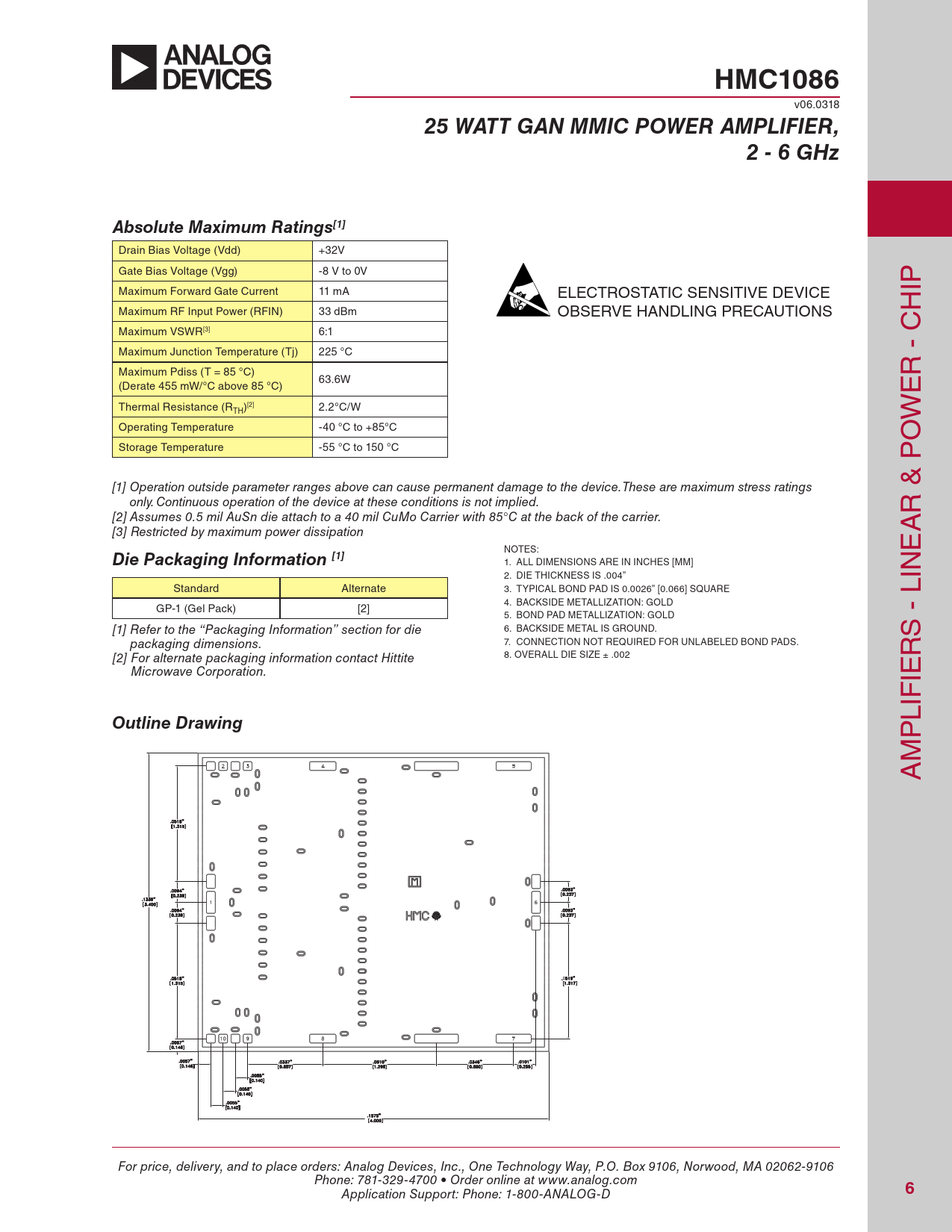 HMC1086. 25 WATT GAN MMIC POWER AMPLIFIER,. 2 - 6 GHz. Absolute Maximum Ratings[1]. Die Packaging Information [1]