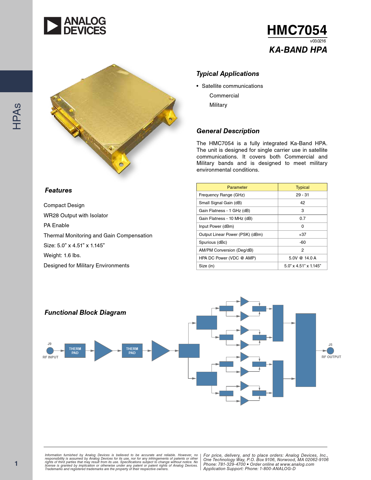 The HMC7054 is a ful y integrated Ka-Band HPA. The unit is designed for single carrier use in satel ite communications. It covers both Commercial and Military bands and is designed to meet military environmental conditions.