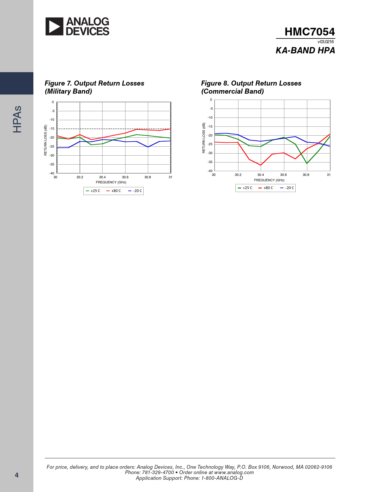 0 s 0 -5 -5 PA -10 -10 ) H ) -15 -15 (dB (dB SS SS -20 -20 LO LO -25 -25 URN URN T T E E R R -30 -30 -35 -35 -40 -4030 30.2 30.4 30.6 30.8 31 30 30.2 30.4 30.6 30.8 31 FREQUENCY (GHz) FREQUENCY (GHz) +25 C +80 C -20 C +25 C +80 C -20 C For price, delivery, and to place orders: Analog Devices, Inc., One Technology Way, P.O. Box 9106, Norwood, MA 02062-9106