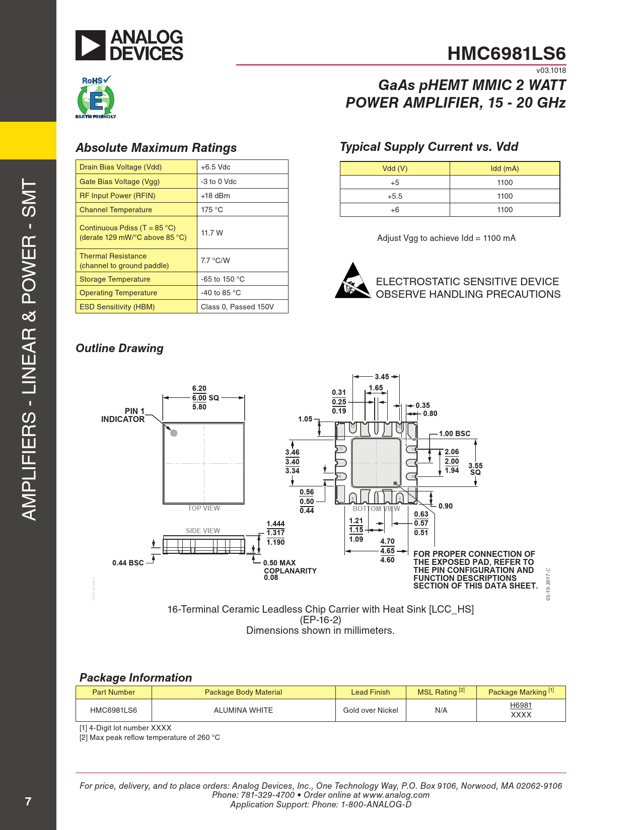 HMC6981LS6. GaAs pHEMT MMIC 2 WATT. POWER AMPLIFIER, 15 - 20 GHz. Absolute Maximum Ratings. Typical Supply Current vs. Vdd