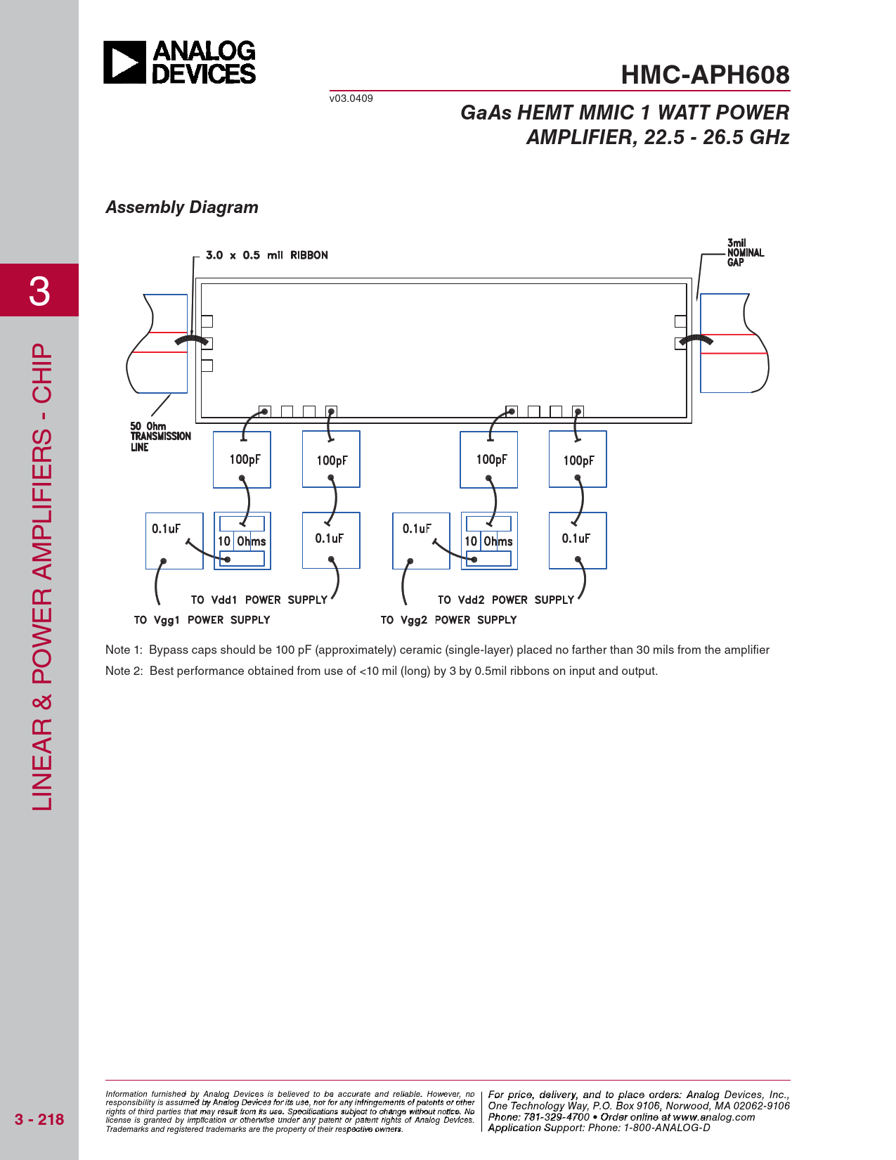 HMC-APH608 v03.0409 GaAs HEMT MMIC 1 WATT POWERAMPLIFIER, 22.5 - 26.5 GHzAssembly Diagram 3 IP H S - C R IE IF L P M R A E W O Note 1: Bypass caps should be 100 pF (approximately) ceramic (single-layer) placed no farther than 30 mils from the amplifi er Note 2: Best performance obtained from use of <10 mil (long) by 3 by 0.5mil ribbons on input and output. R & P A E IN L Information furnish F ed obr pri y Anal ce, de og Device li s vie s r beyli, a eve nd to pla d to be accura ce o te and rder reliabl s e , pl . Ho ease co wever, no For price, delivery, and to place orders: Analog Devices, Inc., responsibility is assumed by Analog Devices for its use, nor for any infringements of patents or other ntact Hittite Microwave Corporation: One Technology Way, P.O. Box 9106, Norwood, MA 02062-9106 rights of third parties that may result from its use. Specifications subject to change without notice. No 3 - 218 20 Alpha Road, Chelmsford, MA 01824 Phone: 978 Phon - e 25 : 7 0 81--3 32 3 9 4 - 3 F 70 ax 0 • O : 978 rder on -li25 n 0 e a - t 33 ww 73 license is granted by implication or otherwise under any patent or patent rights of Analog Devices. w.analog.com Order On Trademarks and registered trademarks are the property of their respective owners. -line at www.h A it p tpite.co licatio m n Support: Phone: 1-800-ANALOG-D