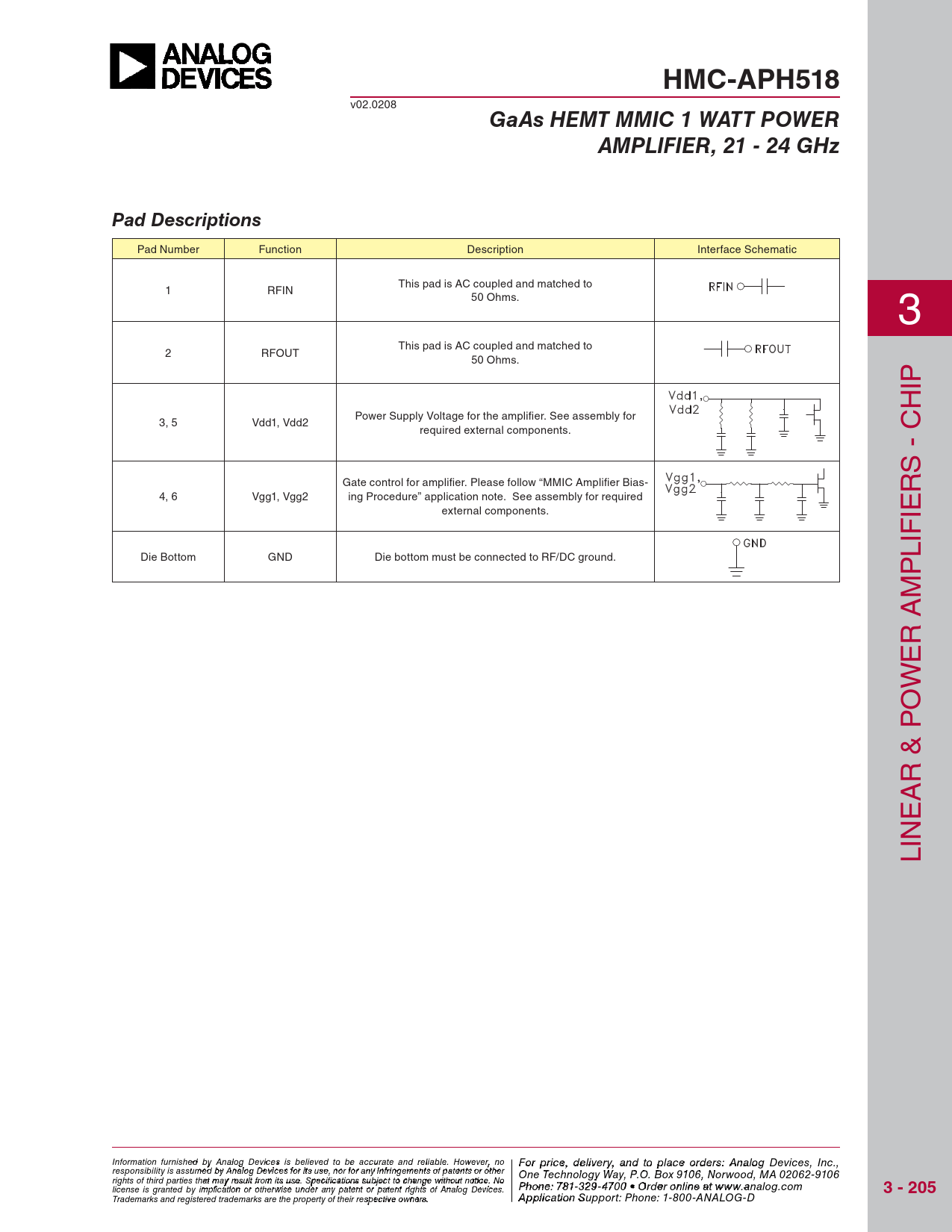 HMC-APH518. GaAs HEMT MMIC 1 WATT POWER. AMPLIFIER, 21 - 24 GHz. Pad Descriptions. 3 - 205