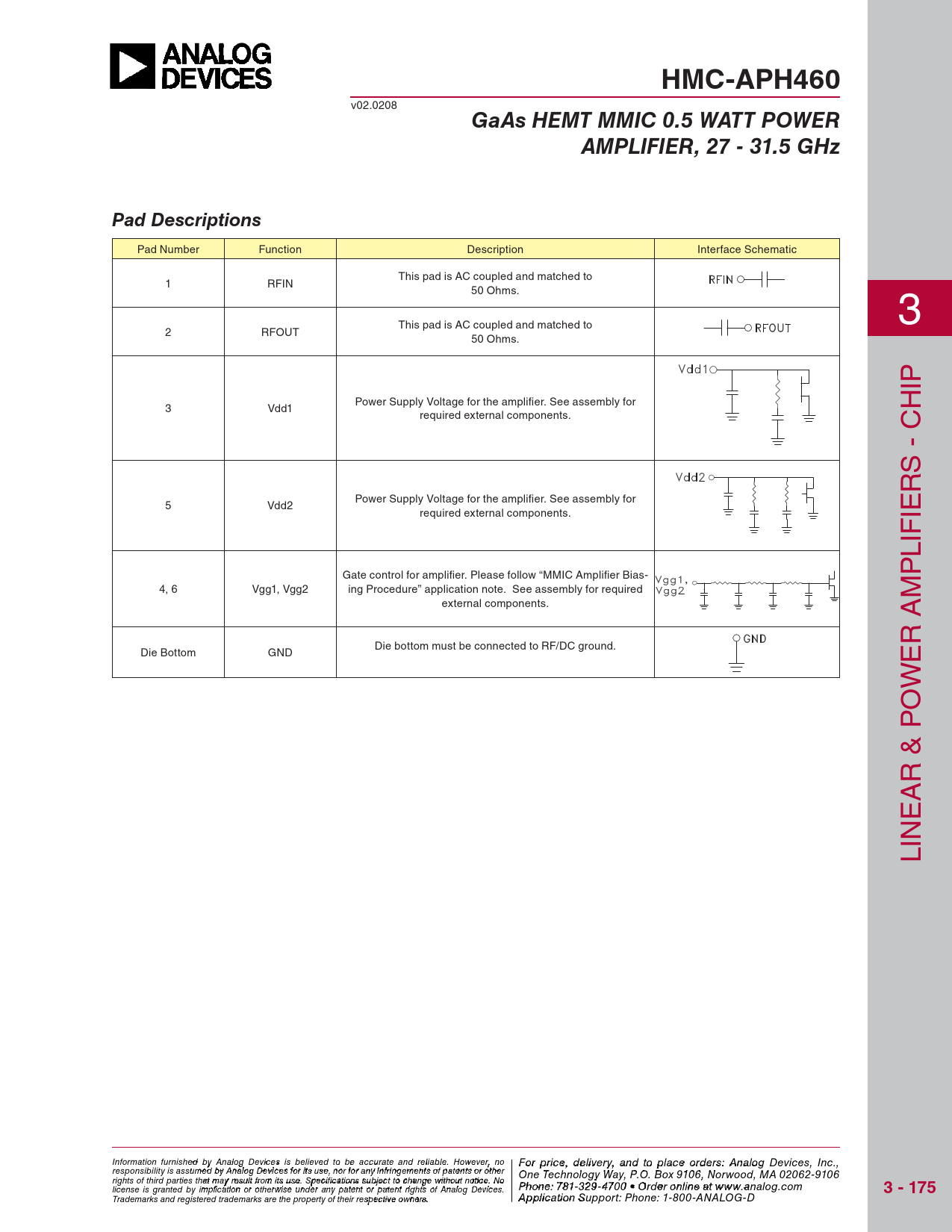 HMC-APH460. GaAs HEMT MMIC 0.5 WATT POWER. AMPLIFIER, 27 - 31.5 GHz. Pad Descriptions. 3 - 175