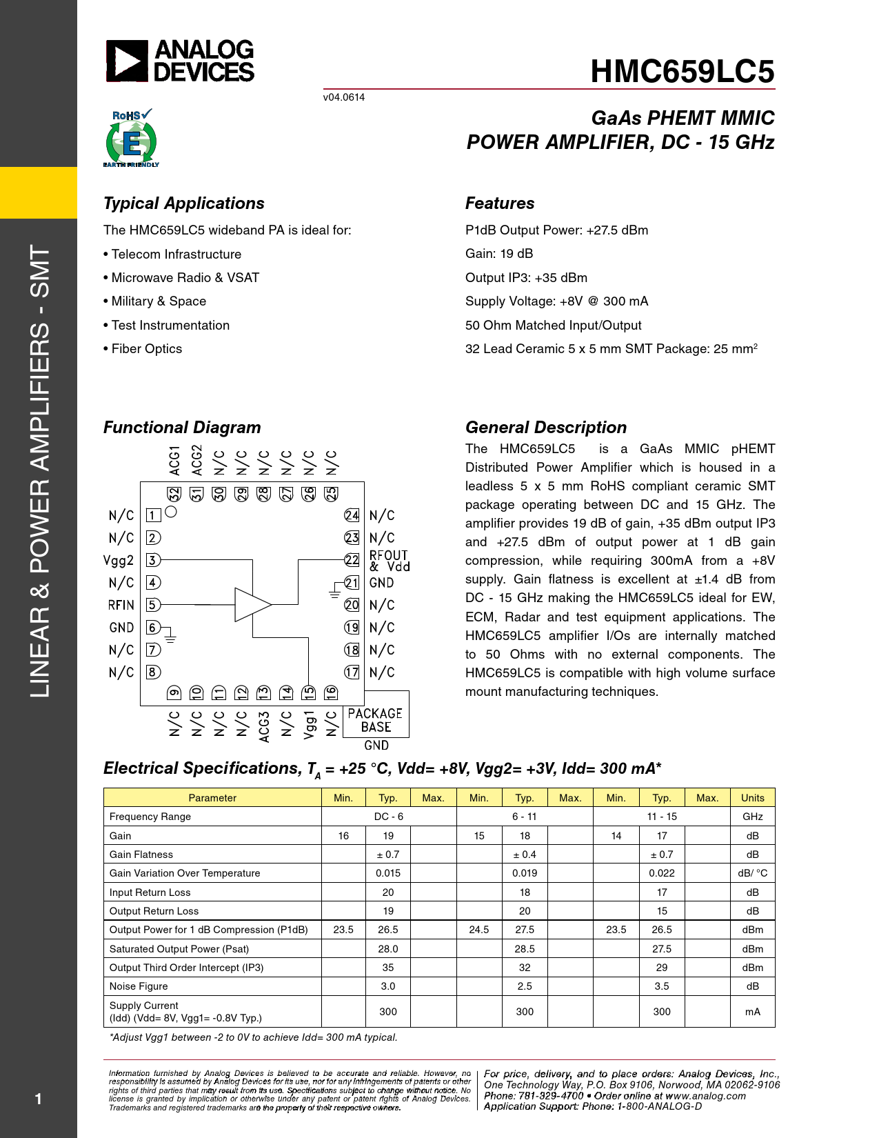 HMC659LC5. GaAs PHEMT MMIC. POWER AMPLIFIER, DC - 15 GHz. Typical Applications. Features. Functional Diagram. General Description