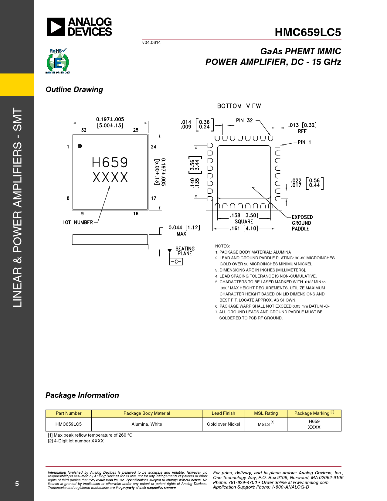 HMC659LC5. GaAs PHEMT MMIC. POWER AMPLIFIER, DC - 15 GHz. Outline Drawing. Package Information