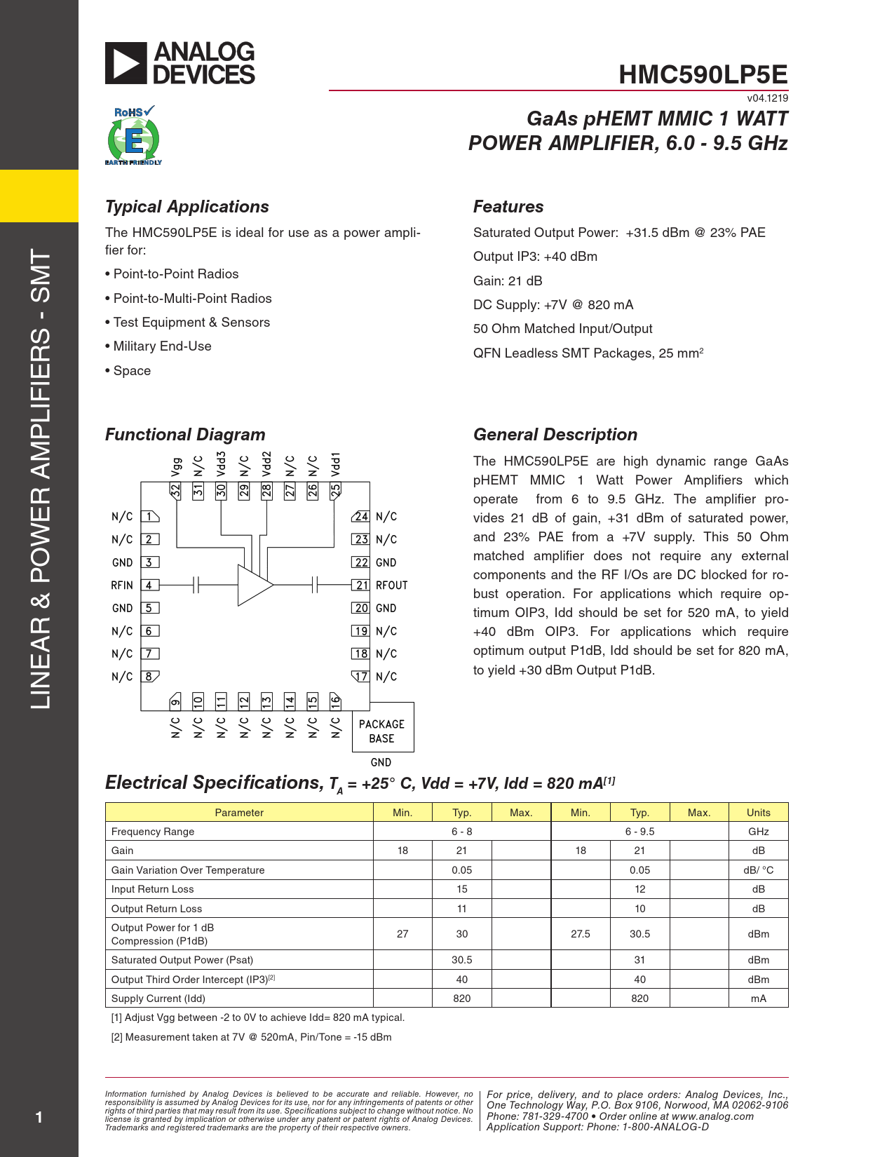 HMC590LP5E v04.1219 GaAs pHEMT MMIC 1 WATTPOWER AMPLIFIER, 6.0 - 9.5 GHzTypical ApplicationsFeatures The HMC590LP5E is ideal for use as a power ampli- Saturated Output Power: +31.5 dBm @ 23% PAE T fier for: Output IP3: +40 dBm M • Point-to-Point Radios Gain: 21 dB • Point-to-Multi-Point Radios DC Supply: +7V @ 820 mA S - S • Test Equipment & Sensors 50 Ohm Matched Input/Output R • Military End-Use QFN Leadless SMT Packages, 25 mm2 IE • Space LIF P Functional DiagramGeneral Description M The HMC590LP5E are high dynamic range GaAs pHEMT MMIC 1 Watt Power Amplifiers which R A E operate from 6 to 9.5 GHz. The amplifier pro- vides 21 dB of gain, +31 dBm of saturated power, W and 23% PAE from a +7V supply. This 50 Ohm O matched amplifier does not require any external components and the RF I/Os are DC blocked for ro- bust operation. For applications which require op- R & P timum OIP3, Idd should be set for 520 mA, to yield A +40 dBm OIP3. For applications which require E optimum output P1dB, Idd should be set for 820 mA, to yield +30 dBm Output P1dB. LIN Electrical Specifications, T = +25° C, Vdd = +7V, Idd = 820 mA[1]A Parameter Min. Typ. Max. Min. Typ. Max. Units Frequency Range 6 - 8 6 - 9.5 GHz Gain 18 21 18 21 dB Gain Variation Over Temperature 0.05 0.05 dB/ °C Input Return Loss 15 12 dB Output Return Loss 11 10 dB Output Power for 1 dB 27 30 27.5 30.5 dBm Compression (P1dB) Saturated Output Power (Psat) 30.5 31 dBm Output Third Order Intercept (IP3)[2] 40 40 dBm Supply Current (Idd) 820 820 mA [1] Adjust Vgg between -2 to 0V to achieve Idd= 820 mA typical. [2] Measurement taken at 7V @ 520mA, Pin/Tone = -15 dBm I F nf o or r p mati roic n e fu , d rnis e h leiv d e b ry y , a Analn o d t g D o p evic leac s i e o s bel rid ev e e rs d t : A o b n e a a lco c g D urat e e a v n ic d re elsi, I abl n e c . H , O owe n vee T r, n e o chn F o o lo r p g ri y W ce a , d y el, P ive.O ry . B , anox 9 d t 10 o pl 6 a , N c o e orrw de o r o s d, M : Anal A 0 o 2 g D 0 e 6 vi 2 c - e 9 s 10 , I 6 nc., responsibility is assumed by Analog Devices for it P s u h se on , no er f: 78 or an 1- y i 3 nfr2in9g-e4 m 7 e 0 nt 0 • O s of paterd nt e s or o r ot n h leir rights of third parties that may result from its use. Specifications subject to change without notice. No ne a O t w n w e Te w ch.a n n ol a o lgog. y Wcao y m , P.O. Box 9106, Norwood, MA 02062-9106 1 license is granted by implication or otherwise under an A y pa p te p n li t o ca r p t atio enn S t rig u ht pp s o o f A rnta: P lo h g D o e n vi e ce : 1 s. -80 P 0 ho -A ne NA : 7 L 81 O -3 G 2 - 9-D4700 • Order online at www.analog.com Trademarks and registered trademarks are the property of their respective owners. Application Support: Phone: 1-800-ANALOG-D Document Outline Typical Applications Features Functional Diagram General Description Electrical Specifications Performance Characteristics Broadband Gain & Return Loss Gain vs. Temperature Input Return Loss vs. Temperature Output Return Loss vs. Temperature P1dB vs. Temperature Psat vs. Temperature P1dB vs. Current Psat vs. Current Output IP3 vs. Temperature 7V @ 520 mA, Pin/Tone = -15 dBm Power Compression @ 8 GHz, 7V @ 820 mA Output IM3, 7V @ 820 mA Gain & Power vs. Supply Current @ 8 GHz Gain & Power vs. Supply Voltage @ 8 GHz Reverse Isolation vs. Temperature, 7V @ 820 mA Power Dissipation Absolute Maximum Ratings Typical Supply Current vs. Vdd Outline Drawing Package Information Pin Descriptions Application Circuit Evaluation PCB List of Materials for Evaluation PCB 115927