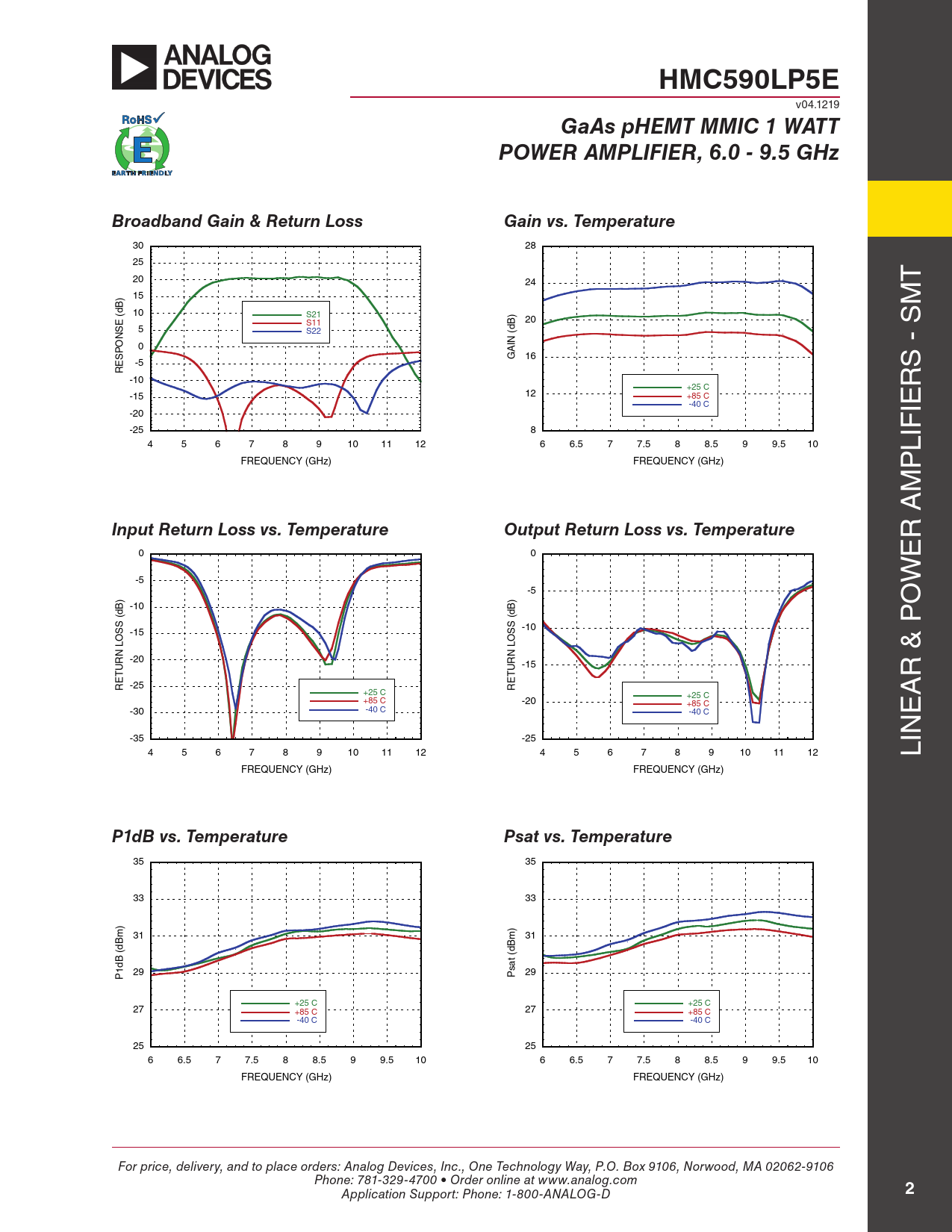 HMC590LP5E. GaAs pHEMT MMIC 1 WATT. POWER AMPLIFIER, 6.0 - 9.5 GHz. Broadband Gain & Return Loss. Gain vs. Temperature